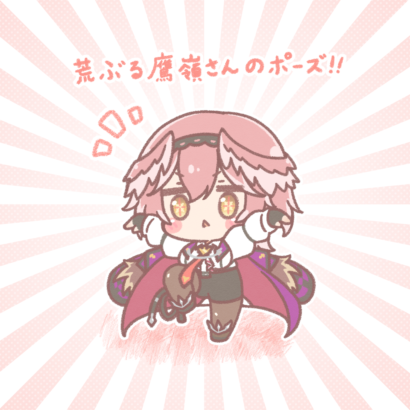 1girl arms_up black_gloves black_hairband black_shoes black_shorts blush_stickers breasts brown_eyes brown_pantyhose chibi colored_shadow commentary_request crane_stance feathered_wings fingerless_gloves gloves hair_between_eyes hairband head_wings highres hololive long_sleeves medium_breasts mitarashi_neko notice_lines pantyhose pantyhose_under_shorts parted_lips pink_hair pink_wings polka_dot polka_dot_background puffy_long_sleeves puffy_sleeves shadow shirt shoes shorts solo standing standing_on_one_leg sunburst sunburst_background takane_lui takane_lui_(1st_costume) translation_request virtual_youtuber white_shirt wings