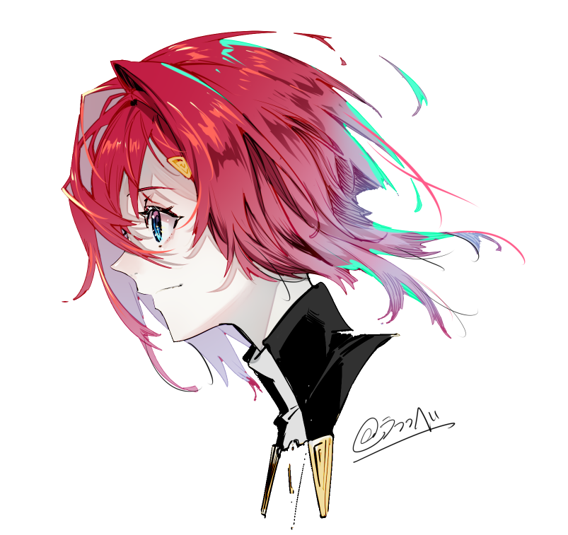 1girl ange_katrina ange_katrina_(1st_costume) artist_name blue_eyes closed_mouth commentary_request cropped_shoulders en_hito from_side gradient_eyes hair_intakes hair_ornament light_smile long_bangs looking_ahead medium_hair multicolored_eyes nijisanji profile purple_eyes red_hair simple_background solo virtual_youtuber white_background
