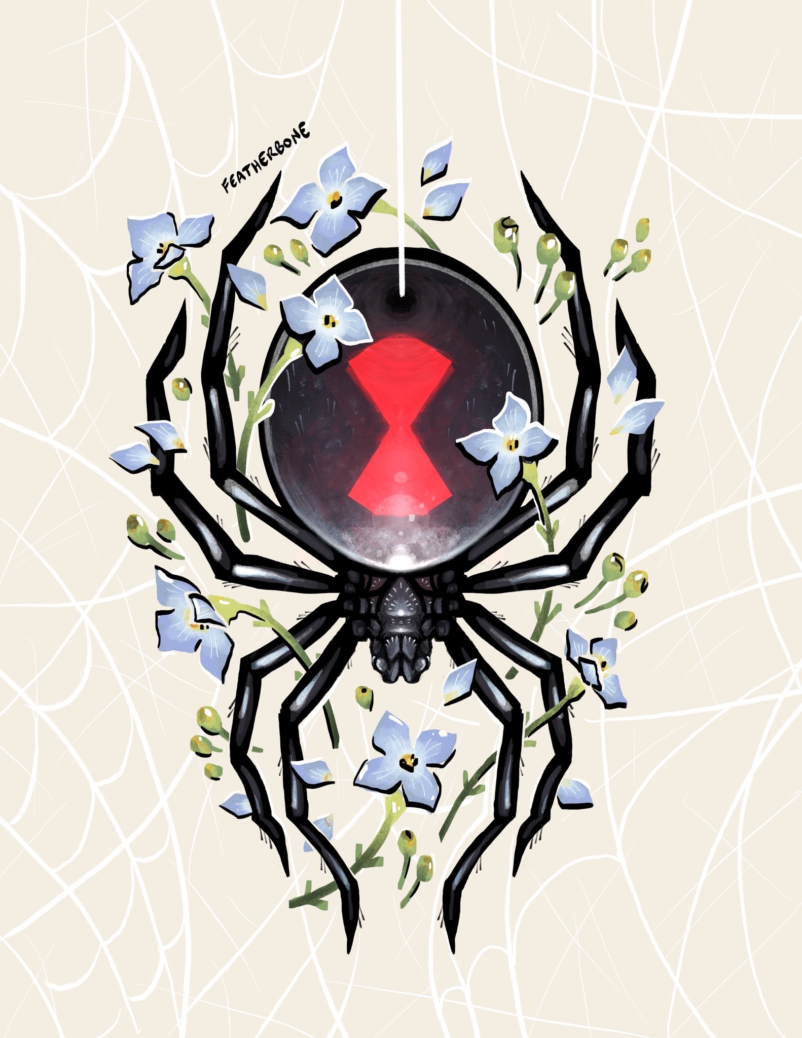 animal_focus artist_name black_widow_(spider) blue_flower bug commentary english_commentary feather-bone flower highres no_humans original solo spider