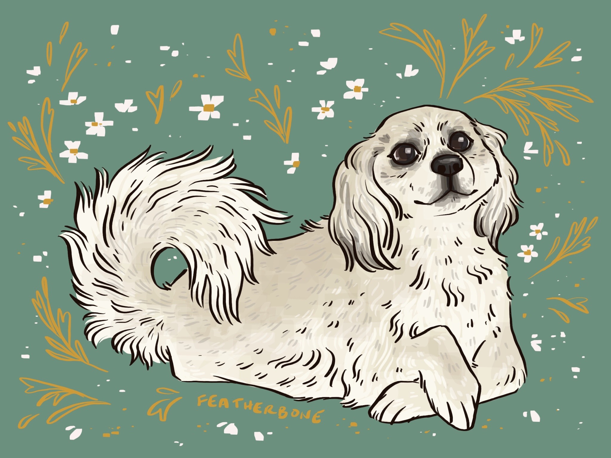 animal_focus aqua_background artist_name cavalier_king_charles_spaniel_(dog) dog feather-bone highres looking_at_viewer no_humans original simple_background solo white_dog white_fur