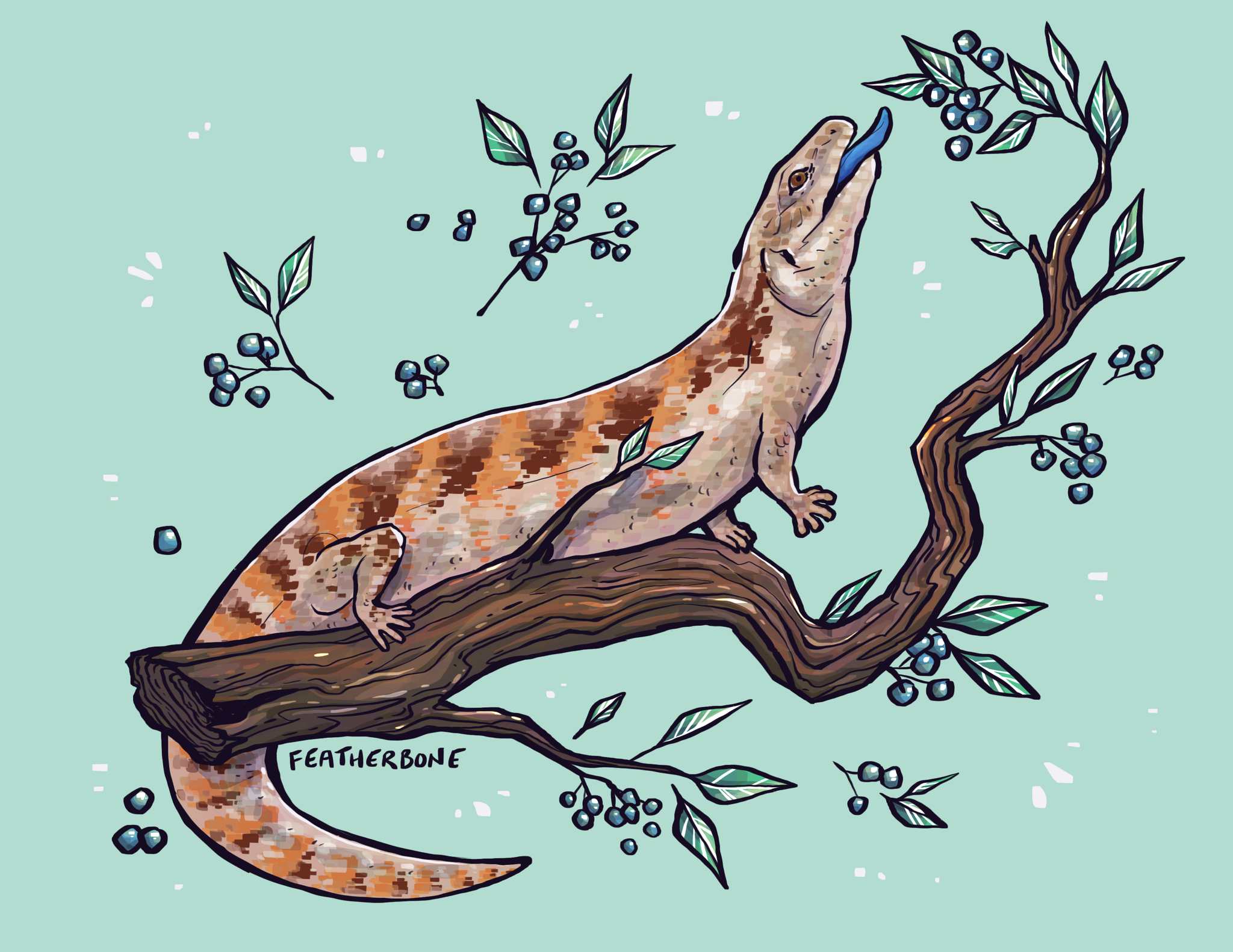animal_focus artist_name blue-tongued_skink blue_tongue branch colored_tongue feather-bone green_background highres lizard no_humans open_mouth original simple_background tongue tongue_out