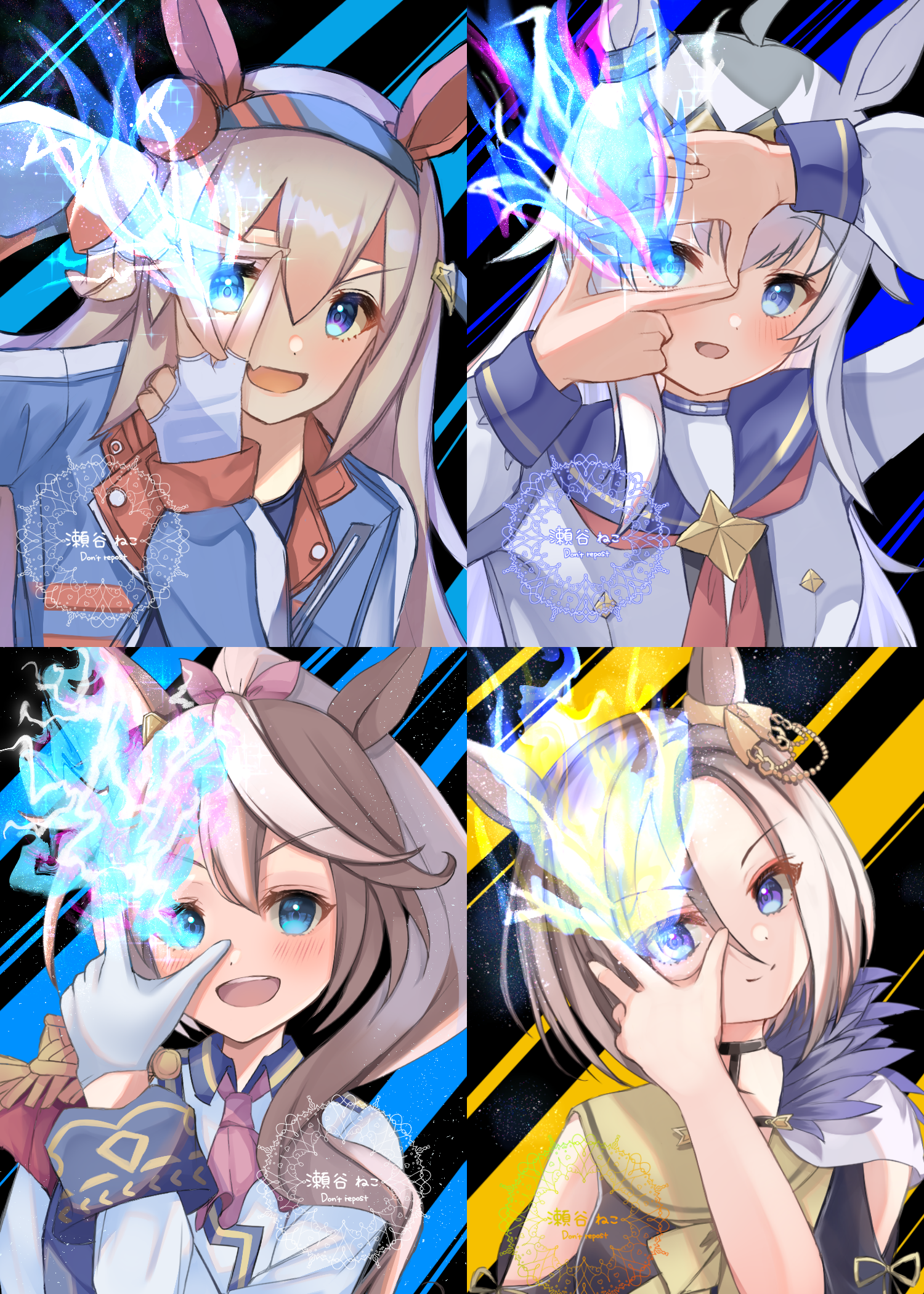 1girl 4girls ahoge air_groove_(empress_road)_(umamusume) air_groove_(umamusume) animal_ears ascot asymmetrical_gloves blue_eyes blue_hairband blue_jacket blue_sailor_collar blue_sports_bra blush bow breasts brooch brown_hair cape closed_mouth commentary_request ear_bow ear_chain ear_covers ear_ornament epaulettes eye_trail fang fingerless_gloves gloves glowing glowing_eye glowing_eyes grey_hair hair_between_eyes hairband headband high_ponytail highres horse_ears horse_girl horse_tail jacket jewelry light_trail linked_piercing long_hair long_sleeves looking_at_viewer multicolored_hair multicolored_hairband multicolored_jacket multiple_girls neckerchief oguri_cap_(starlight_beat)_(umamusume) oguri_cap_(umamusume) open_mouth piercing pink_ascot ponytail red_cape red_headband red_neckerchief sailor_collar setani_neco shirt short_hair simple_background single_epaulette skin_fang smile sports_bra star_brooch streaked_hair striped_clothes striped_hairband tail tamamo_cross_(fast_as_lightning)_(umamusume) tamamo_cross_(umamusume) teeth tokai_teio_(peak_joy)_(umamusume) tokai_teio_(umamusume) two-tone_hair two-tone_hairband two-tone_jacket umamusume upper_body upper_teeth_only very_long_hair white_background white_hair white_jacket white_shirt white_streaks yellow_bow yellow_sailor_collar