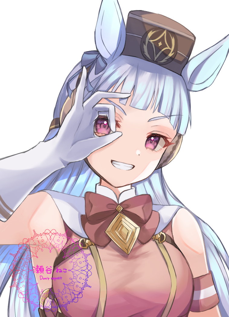 1girl animal_ears armband blunt_bangs blush bow bowtie breasts brown_hat commentary dress ear_bow gloves gold_ship_(red_strife)_(umamusume) gold_ship_(umamusume) grey_hair hat horse_ears horse_girl long_hair looking_at_viewer medium_breasts open_mouth pillbox_hat purple_eyes red_bow red_bowtie red_dress setani_neco simple_background sleeveless sleeveless_dress smile solo striped_armband striped_clothes teeth umamusume upper_body white_background white_gloves