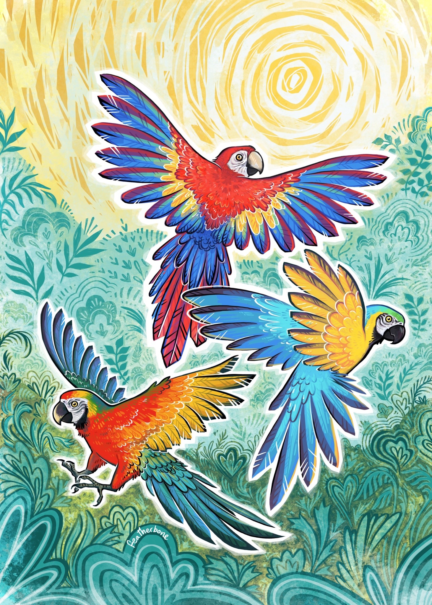 animal_focus artist_name bird commentary day english_commentary feather-bone flying highres macaw no_humans original outdoors parrot