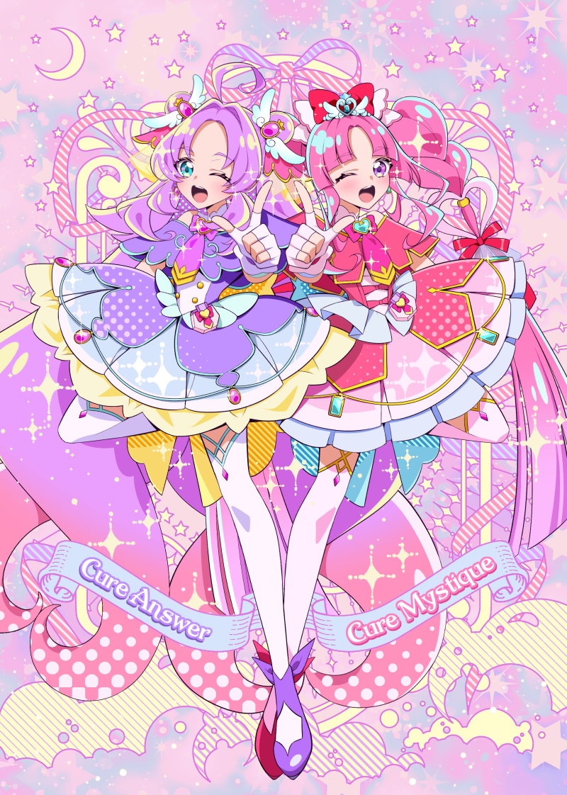 2girls ;d ahoge akechi_anna back_bow blue_bow blue_eyes blunt_bangs bow bowtie braid brooch capelet character_name commentary_request crescent_moon cure_answer cure_mystique double_bun dress earrings fingerless_gloves frilled_dress frills full_body glove_bow gloves gradient_hair hair_bow hair_bun hair_intakes hair_ornament hair_ribbon heart heart_brooch heart_hair_ornament heart_in_eye impossible_hair index_finger_raised jewelry kobayashi_mikuru large_bow layered_dress leg_up long_hair looking_at_viewer magical_girl meitantei_precure! moon multicolored_hair multiple_girls neko_hunsou one_eye_closed open_mouth pact_holder parted_bangs pink_bow pink_bowtie pink_capelet pink_dress precure puckered_lips purple_bow purple_bowtie purple_capelet purple_dress purple_eyes purple_hair rainbow red_bow red_ribbon revision ribbon short_dress sidelocks sleeveless sleeveless_dress smile standing standing_on_one_leg star_(sky) symbol_in_eye teeth thighhighs twin_braids upper_teeth_only very_long_hair white_gloves white_thighhighs wing_hair_ornament yellow_bow