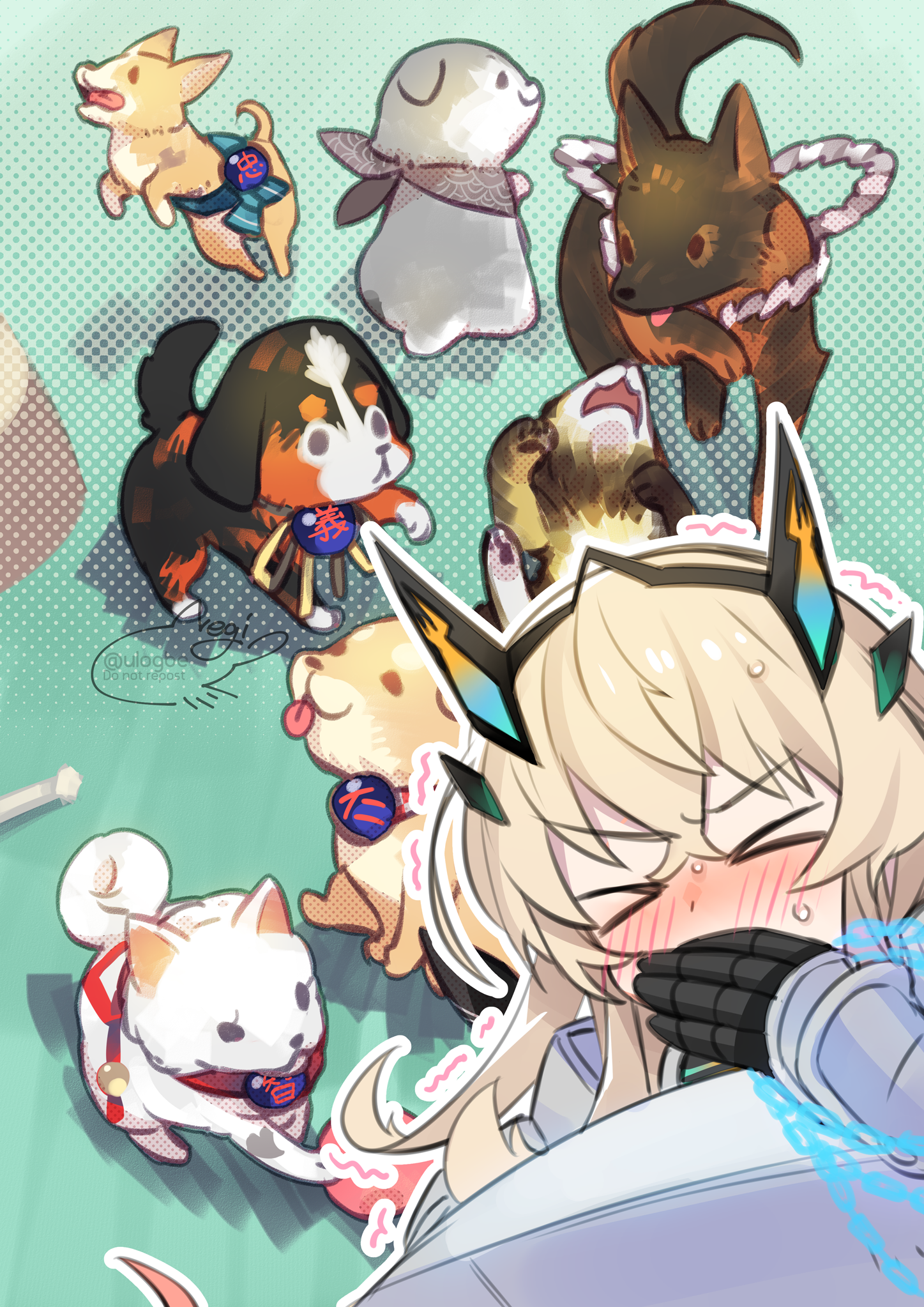 >_< 1girl armor ball bandana bandana_around_neck barghest_(fate) barghest_(first_ascension)_(fate) beads blonde_hair blush bone breastplate chain checkered_bandana closed_eyes daikaku_(fate) dog dousetsu_(fate) fate/grand_order fate_(series) gauntlets green_bandana grey_bandana highres horns keno_(fate) kobungo_(fate) long_hair multiple_dogs negi_(ulog'be) pauldrons red_bandana rope shinbei_(dog)_(fate) shino_(fate) shoulder_armor sousuke_(fate)