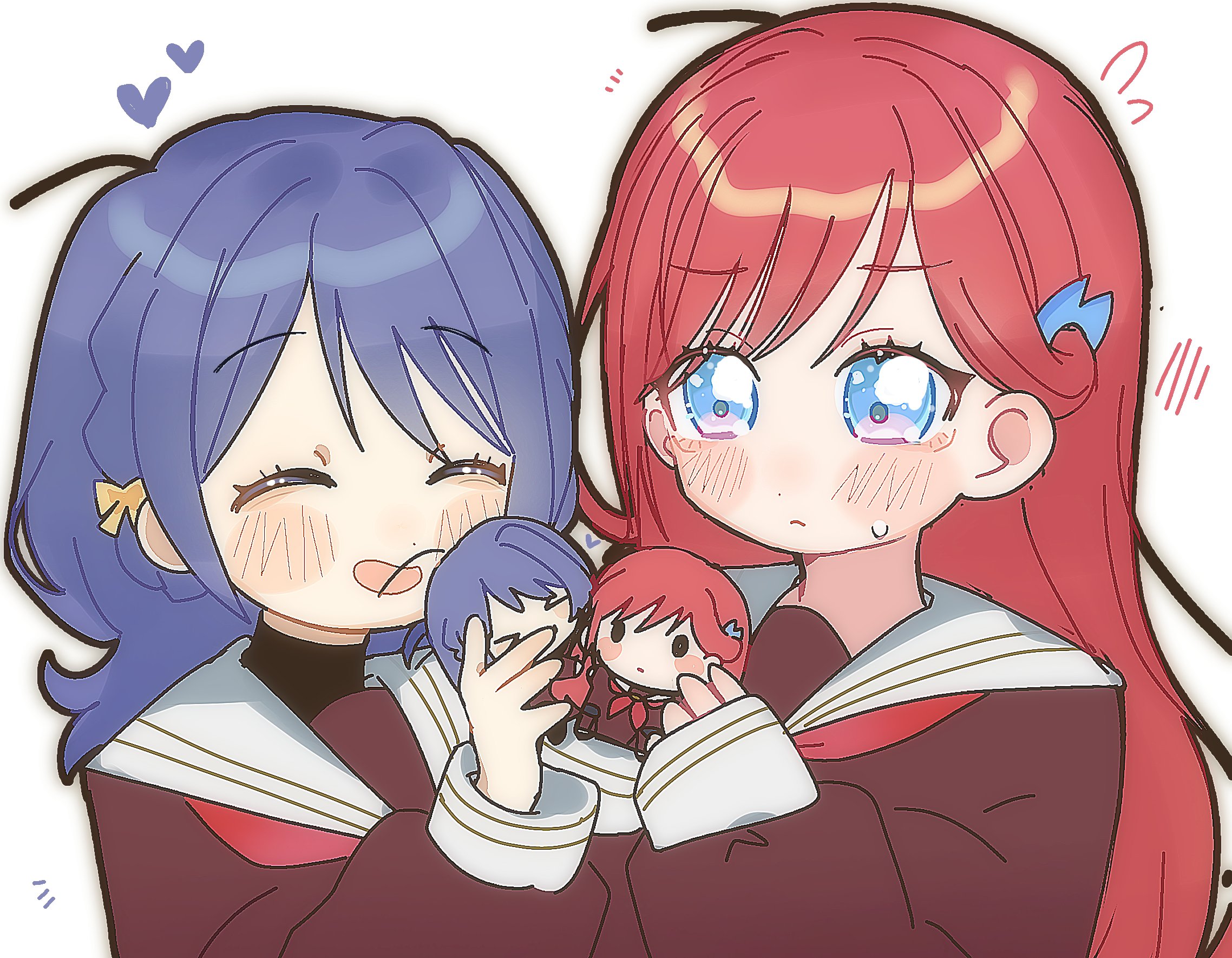 >_< 2girls :d ^_^ black_shirt blue_eyes blush bow brown_dress character_doll closed_eyes closed_mouth col_person commentary doll dress flying_sweatdrops hair_bow hair_ornament hasu_no_sora_school_uniform heart highres holding holding_doll kinjou_maika leaf_hair_ornament light_frown link!_like!_love_live! long_hair long_sleeves love_live! multiple_girls neckerchief open_mouth red_hair red_neckerchief reizawa_aoi sailor_collar sailor_dress school_uniform shirt simple_background smile straight_hair sweatdrop turtleneck turtleneck_shirt undershirt untranslatable_commentary upper_body virtual_youtuber white_background white_sailor_collar winter_uniform yellow_bow