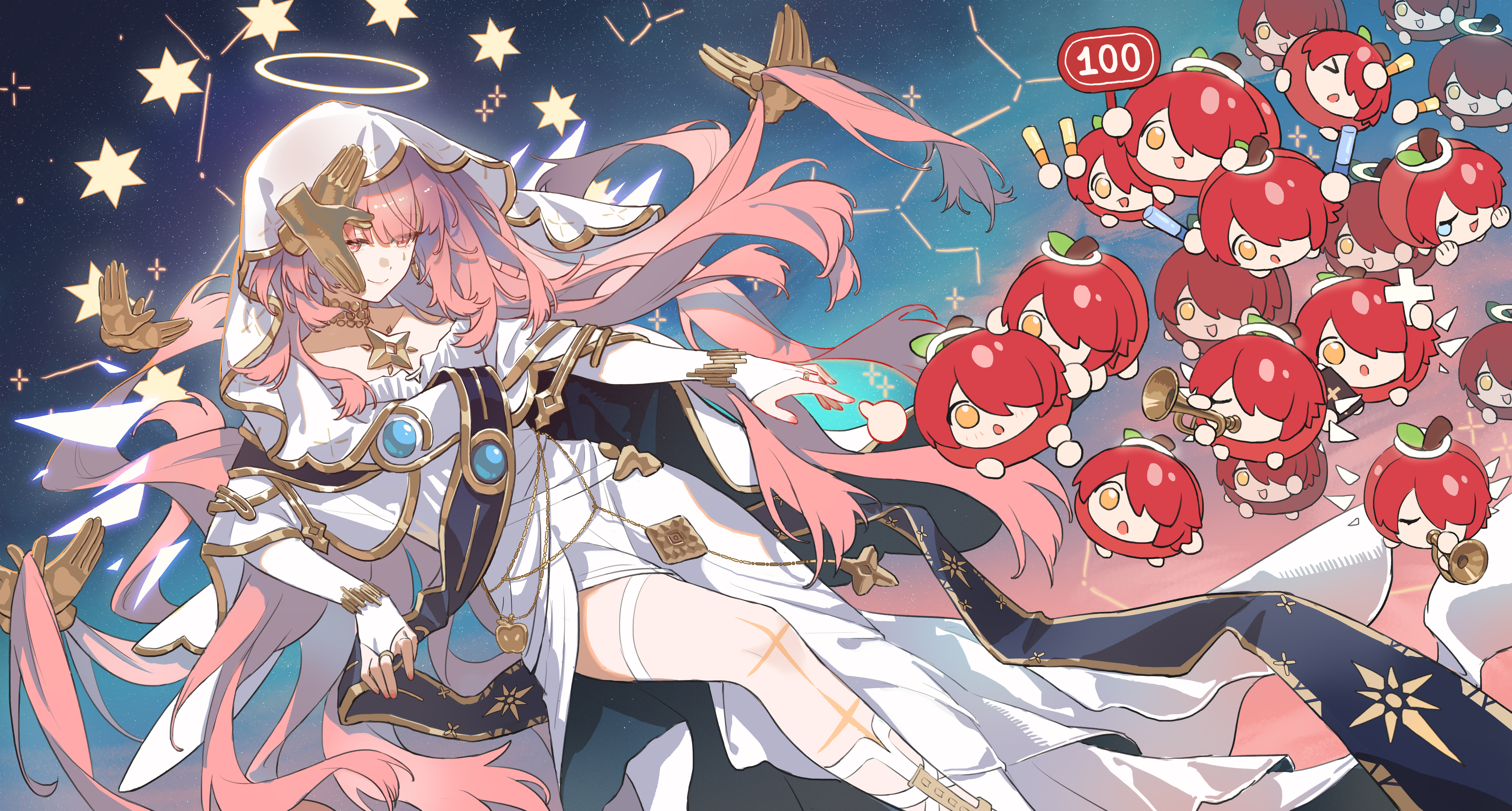 1girl absurdres adoptive_siblings ambience_synesthesia apple arknights commentary_request detached_wings dress energy_wings exusiai_(apple)_(arknights) exusiai_(arknights) food fruit glowstick gold_collar hair_over_one_eye halo highres holding holding_glowstick holding_instrument holding_trumpet instrument lemuen_(arknights) lemuen_(requiem_vesperis)_(arknights) long_hair music official_alternate_costume open_mouth penlight_(glowstick) pink_eyes pink_hair playing_instrument red_hair smile tianqiyubao_euc traditional_halo trumpet two-tone_cape veil white_dress white_halo white_veil wings yellow_eyes