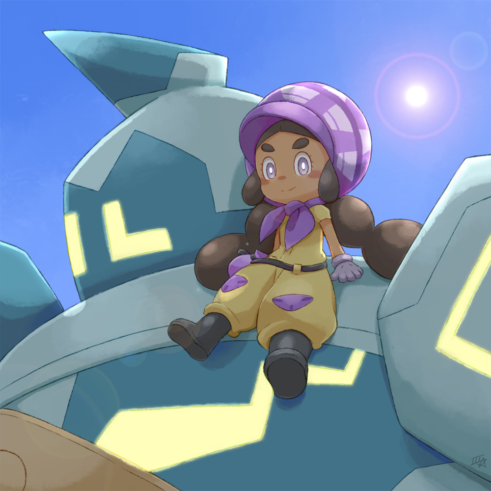 1girl belt black_belt black_boots black_hair blue_sky blush bonnet boots bright_pupils closed_mouth commentary_request dark-skinned_female dark_skin day gen_5_pokemon gloves golurk hapu_(pokemon) lens_flare long_hair nintendo pokemon pokemon_(creature) pokemon_sun_and_moon purple_bonnet purple_eyes purple_gloves samsung_(yuzuikka) short_sleeves sitting sky smile thick_eyebrows white_pupils