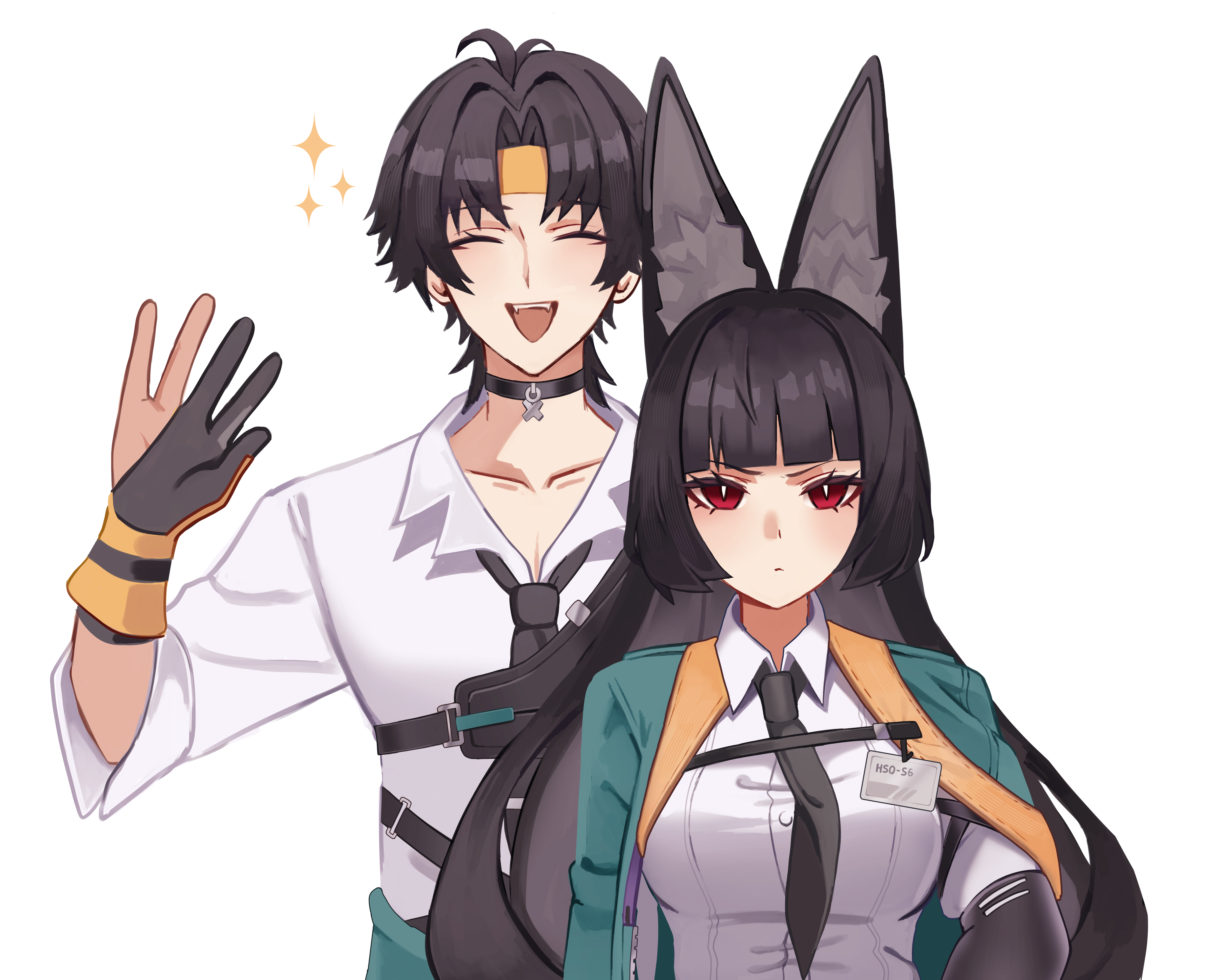 1boy 1girl absurdres animal_ears asaba_harumasa bandana black_choker black_hair black_necktie by_nearreya choker collared_shirt couple fox_ears fox_girl height_difference hetero highres hoshimi_miyabi long_hair looking_at_viewer necktie red_eyes shirt short_hair simple_background smile upper_body white_background white_shirt zenless_zone_zero