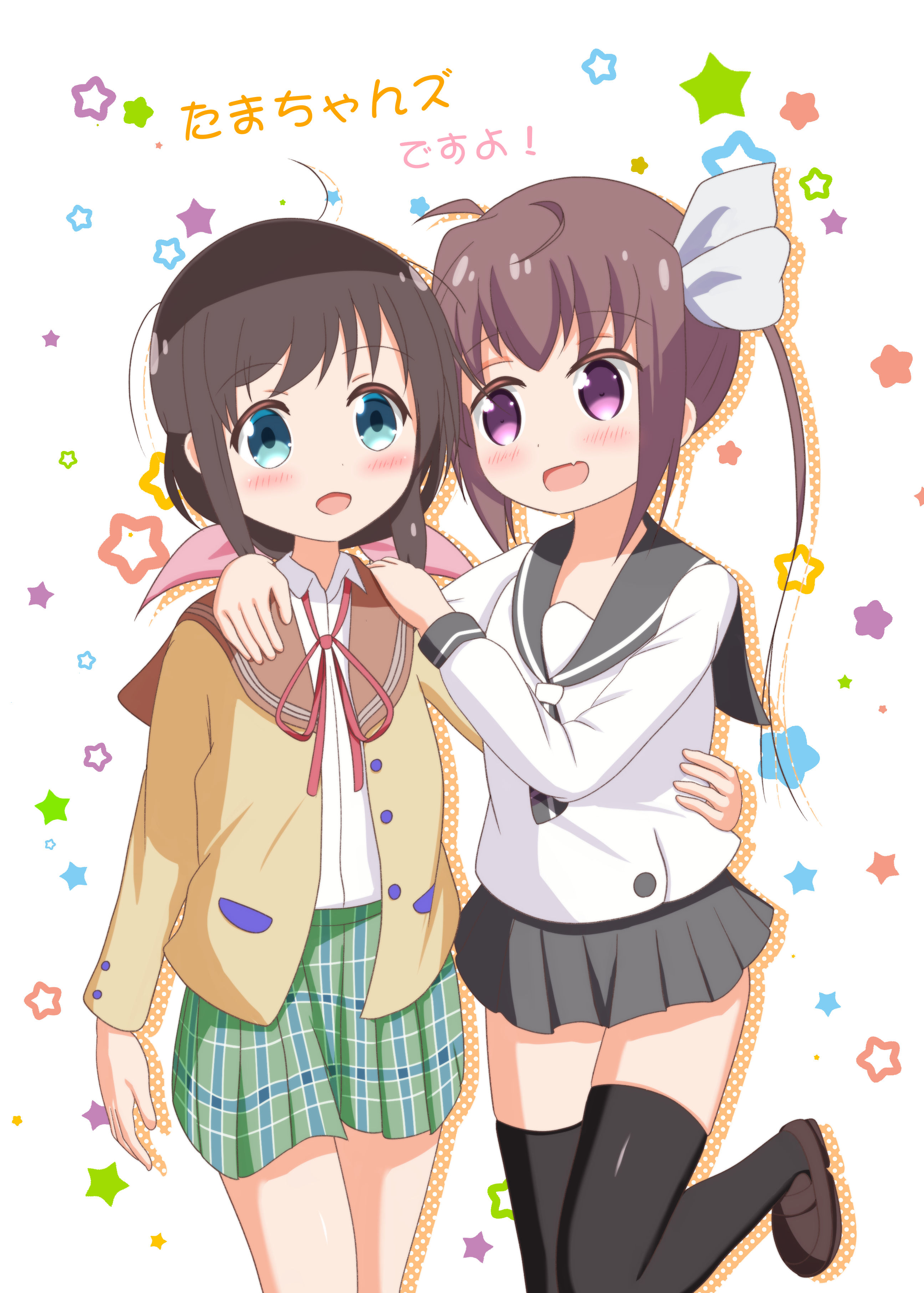 ! 2girls black_thighhighs blue_eyes blush brown_hair crossover dot_nose fang feet_out_of_frame female_focus grey_sailor_collar grey_skirt honda_tamaki japanese_text legs long_hair long_sleeves looking_at_viewer momochi_tamate multiple_girls open_clothes purple_eyes red_ribbon ribbon sailor_collar school_uniform serafuku shirt shoes skin_fang skirt slow_start standing star_(symbol) stella_no_mahou sx_xkx thighhighs translation_request white_shirt