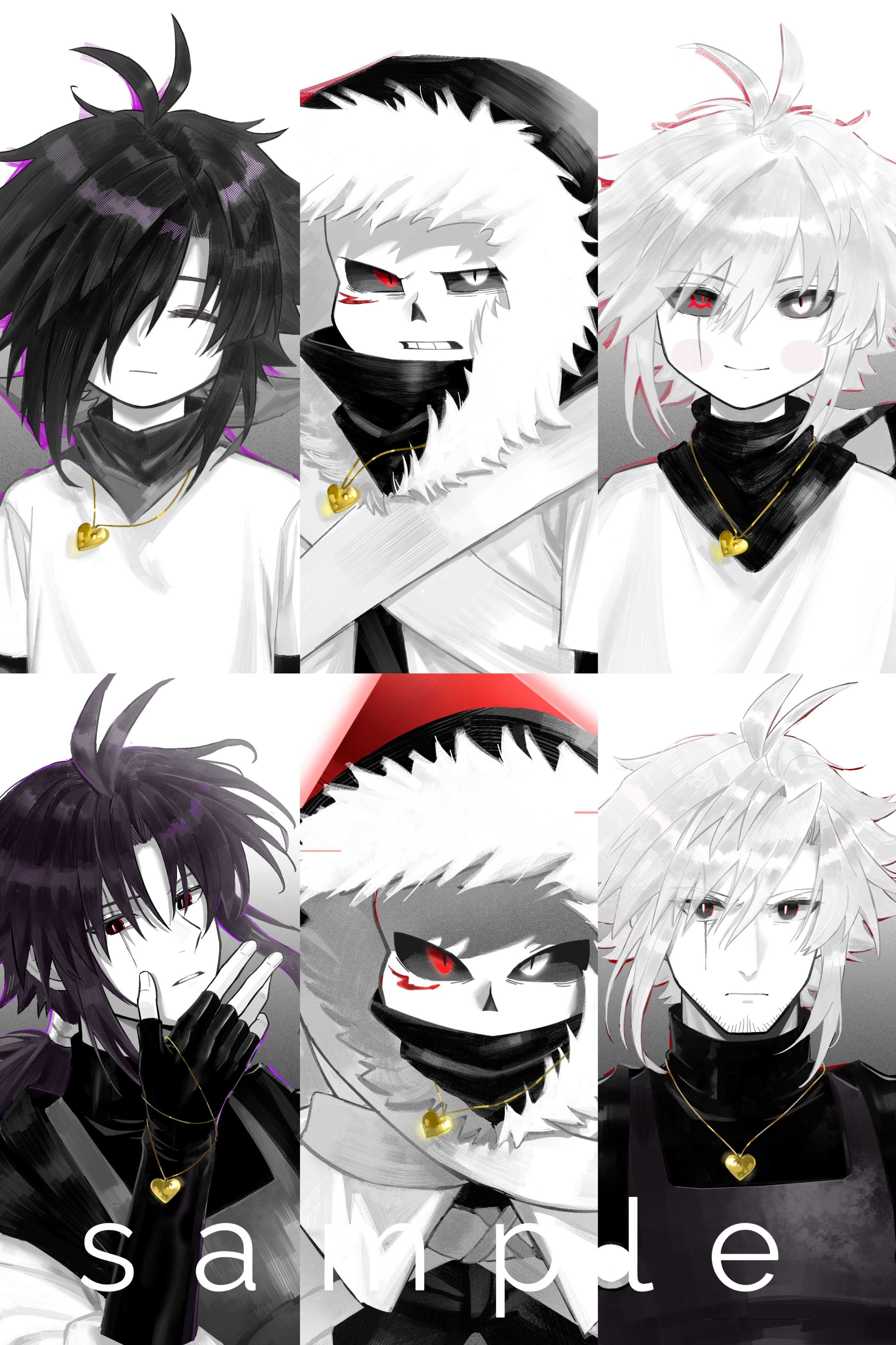 6+boys :| ^_^ absurdres age_progression alternate_universe angry antenna_hair arms_at_sides bandana bandana_around_neck black_gloves black_hair black_hood black_pants black_sclera black_sweater bright_pupils chara_(undertale) child circle_facial_mark clenched_teeth closed_eyes closed_mouth colored_sclera column_lineup commentary covered_mouth cowboy_shot dual_persona english_commentary expressionless facial_hair facial_mark facing_viewer film_grain fingerless_gloves fingernails frisk_(undertale) fur-trimmed_jacket fur_trim gloves gold_necklace grey_bandana hair_over_one_eye hair_tie hanbaobaobaozhu hand_up heart heart_necklace heterochromia highres holding holding_jewelry holding_necklace hood hood_up hooded_jacket jacket jewelry layered_sleeves leaning_forward long_sleeves looking_at_viewer low_ponytail male_focus medium_hair multiple_boys necklace one_eye_covered open_clothes open_jacket pants ponytail puffy_sleeves red_eyes sample_watermark sans_(undertale) scar scar_across_eye scar_on_face shirt short-sleeved_jacket short_over_long_sleeves short_sleeves sidelocks simple_background slit_pupils smile sweater teeth three-quarter_sleeves turtleneck turtleneck_sweater undertale utdr_(toby_fox) v-shaped_eyebrows watermark white_background white_eyes white_hair white_jacket white_pupils white_shirt wind xtale