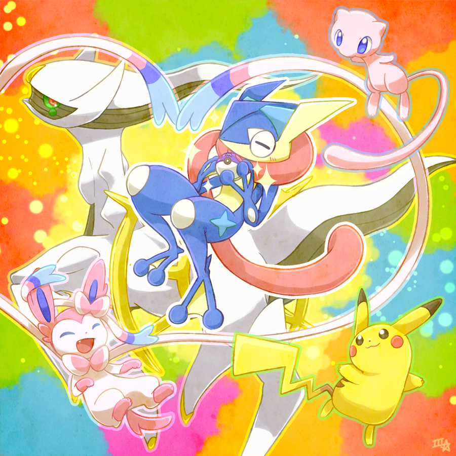 :3 =_= arceus blue_eyes closed_eyes closed_mouth colored_sclera commentary_request fang gen_1_pokemon gen_4_pokemon gen_6_pokemon green_sclera greninja holding holding_poke_ball legendary_pokemon long_tongue master_ball mew_(pokemon) mythical_pokemon nintendo open_mouth pikachu poke_ball pokemon pokemon_(creature) pokemon_focus red_eyes samsung_(yuzuikka) smile sparkle sylveon tongue very_long_tongue