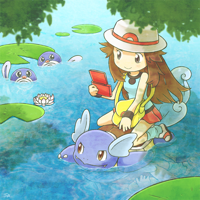 1girl aqua_shirt aqua_socks bag black_eyes brown_eyes brown_hair closed_mouth commentary_request fangs flower gen_1_pokemon handbag hat holding_pokedex leaf leaf_(pokemon) lily_pad long_hair loose_socks nintendo nostrils pokedex pokemon pokemon_(creature) pokemon_firered_and_leafgreen poliwag red_skirt reflection reflective_liquid riding riding_pokemon samsung_(yuzuikka) shirt shoes skirt sleeveless sleeveless_shirt smile socks wartortle water white_flower white_hat white_shoes yellow_bag