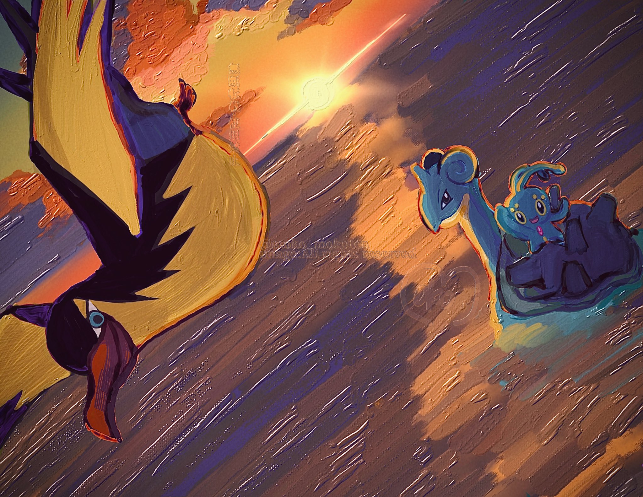 bird blue_eyes closed_mouth cloud commentary_request flying gen_1_pokemon gen_4_pokemon highres kilowattrel lapras legendary_pokemon manaphy moko_mokoten mythical_pokemon nintendo no_humans open_mouth painting_(medium) pokemon pokemon_(creature) pokemon_focus riding riding_pokemon sky smile sun traditional_media water