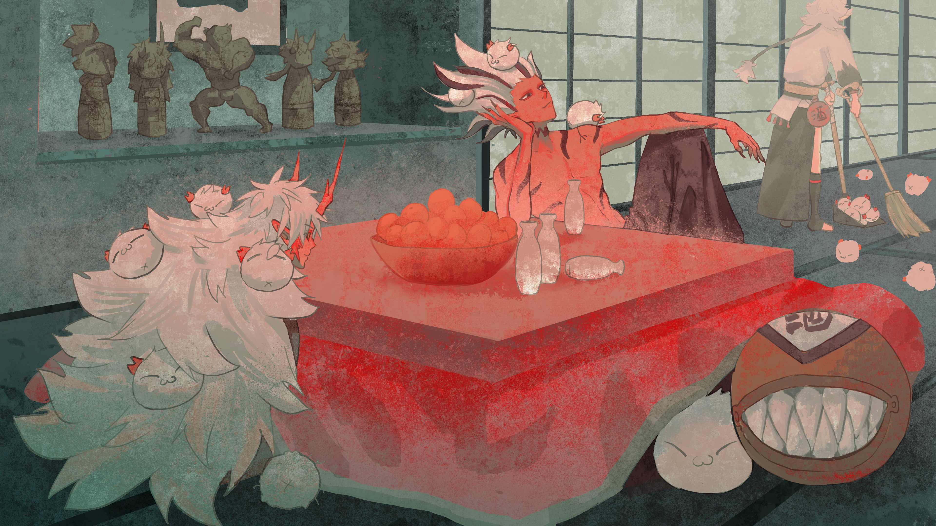2boys 3boys absurdres bottle broom chain character_request colored_skin commentary gensyuuu highres hoshiguma_douji_(onmyoji) knee_up kotatsu long_hair male_focus multiple_boys onmyoji red_skin sake_bottle short_hair shuten_douji_(onmyoji) sitting sweeping table topless_male very_long_hair white_hair