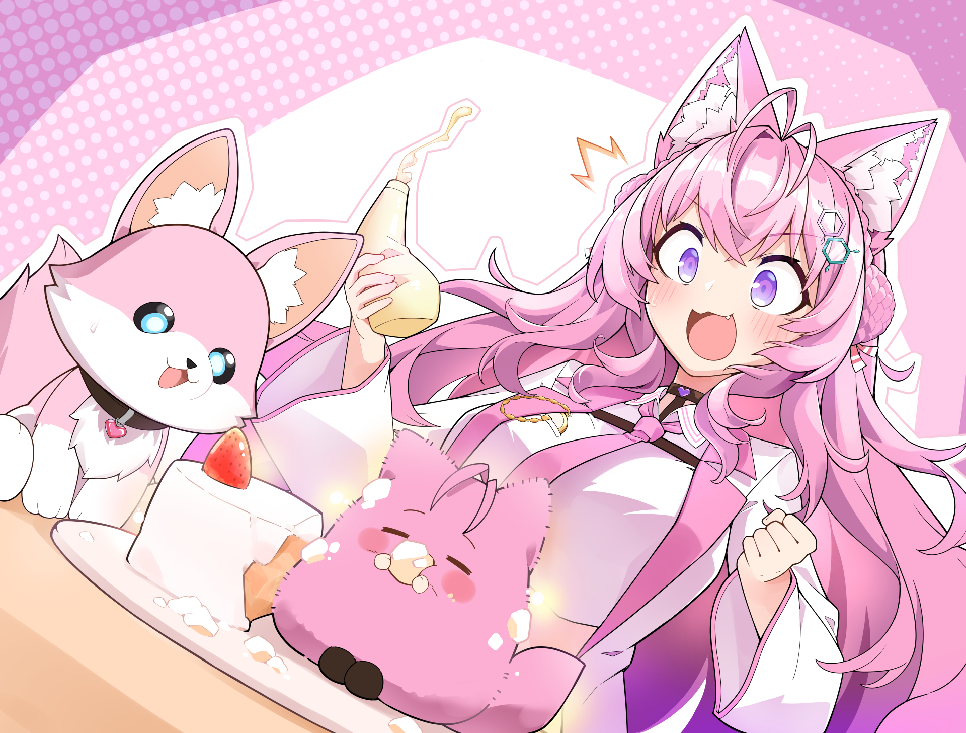 1girl animal_ears antenna_hair black_choker blush braid braided_bun breasts cake choker clenched_hands coat collared_shirt commentary crown_braid double_bun eating fang food hair_bun hair_ornament hair_ribbon hakui_koyori hakui_koyori_(1st_costume) heart heart_choker highres hololive jb_jagbung kokoro_(hakui_koyori) lab_coat large_breasts long_hair long_sleeves mayonnaise_bottle mofukoyo_(hakui_koyori) necktie open_clothes open_coat open_mouth pink_background pink_hair pink_necktie pink_ribbon pocket_watch polka_dot polka_dot_background purple_eyes ribbon shirt smile virtual_youtuber watch white_coat white_shirt wide-eyed wolf_ears wolf_girl