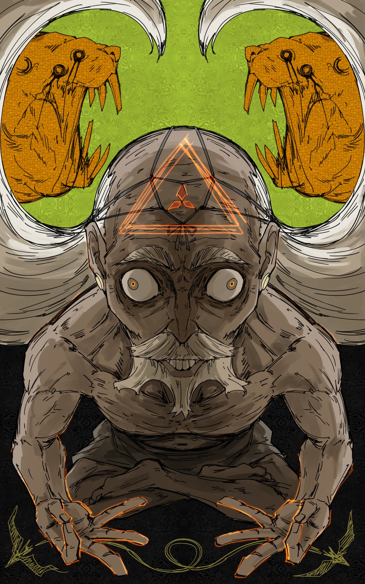 1boy beard crossed_legs dark_skin dhruv_lakdawalla facial_hair highres jujutsu_kaisen kankan33333 long_hair old shikigami simple_background teeth white_hair yellow_eyes