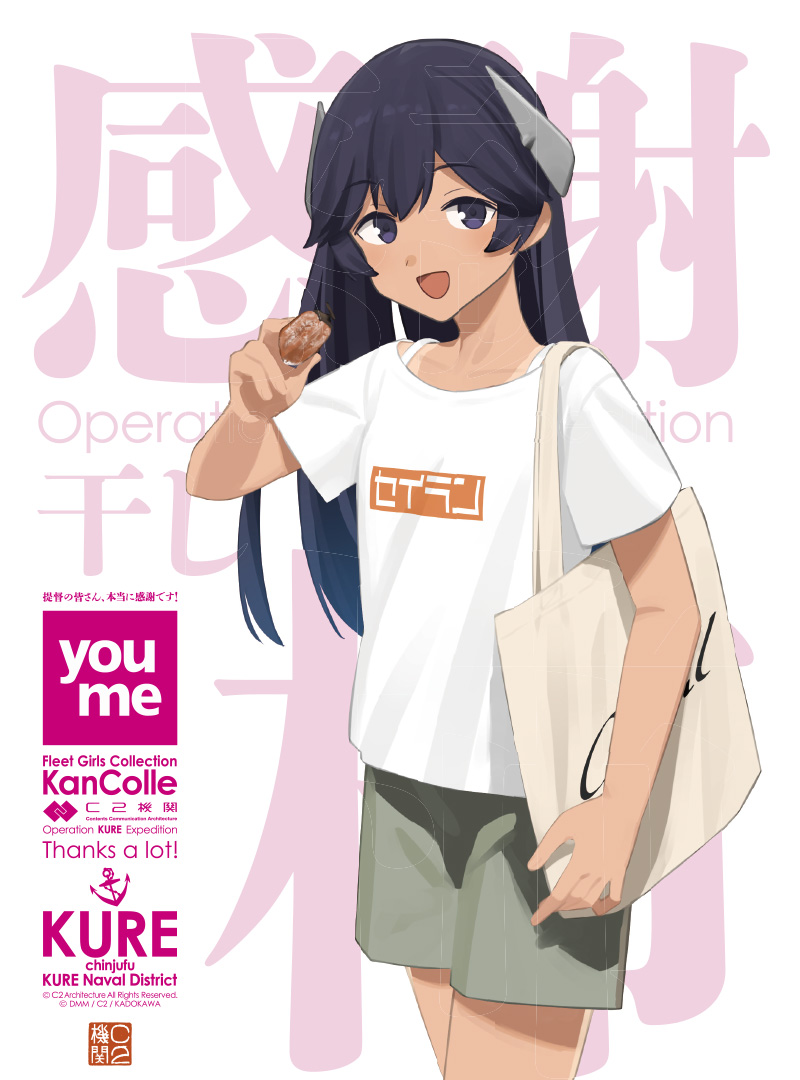 1girl bag black_eyes black_hair clothes_writing commentary_request food green_shorts grey_shorts headgear holding holding_food i-400_(kancolle) i-400_(kure)_(kancolle) kantai_collection long_hair mixed-language_text official_alternate_costume official_art one-piece_tan shibafu_(glock23) shirt short_shorts shorts solo t-shirt tan tanline translation_request watermark white_shirt