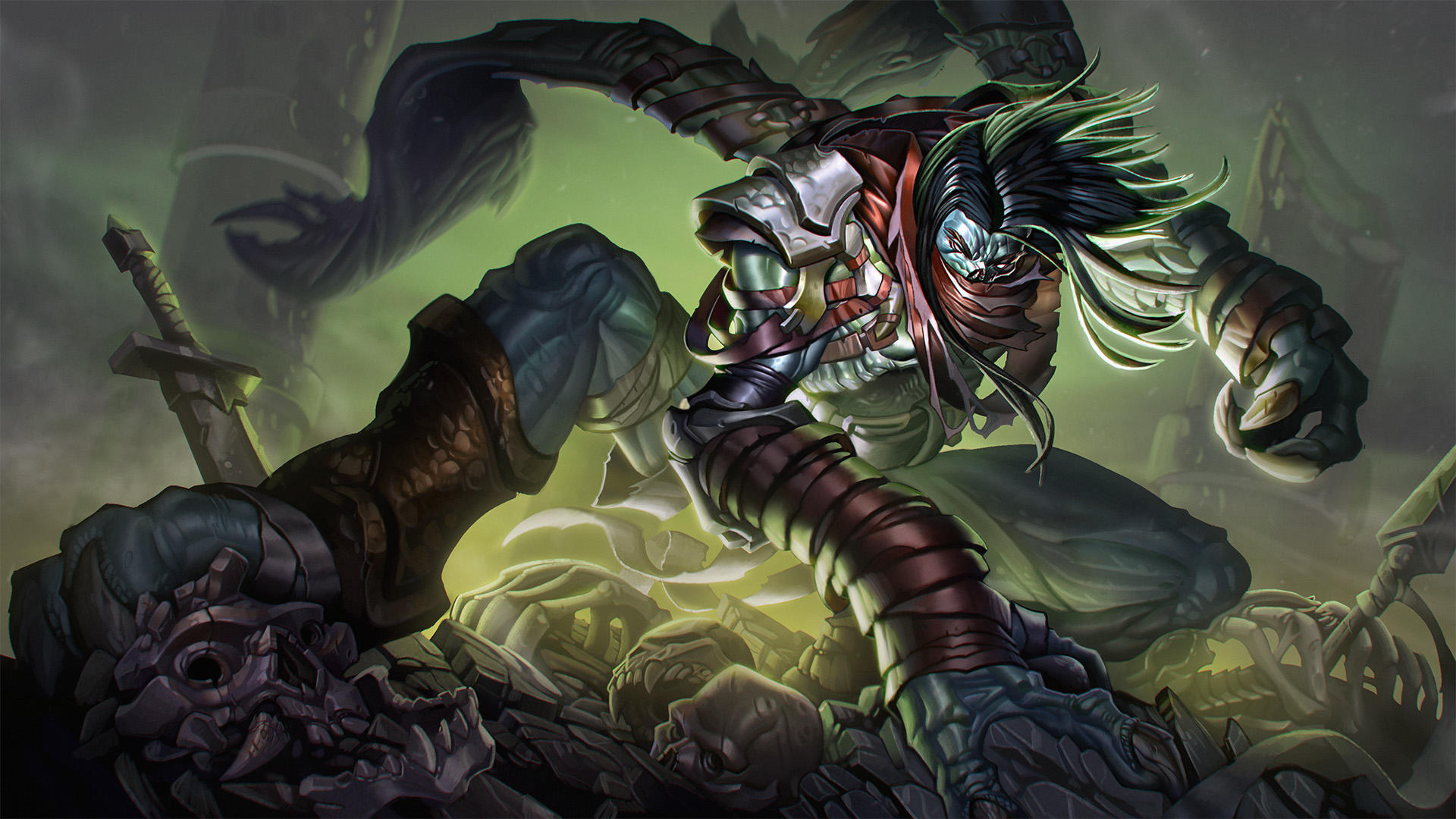 1boy armor bandages black_hair blue_skin bone bracer brown_scarf claws colored_skin commentary emaciated english_commentary fog full_body glowing green_background highres legacy_of_kain light_particles male_focus mask mouth_mask no_pupils outdoors parted_bangs parted_hair pillar polearm rayph_beisner raziel_(legacy_of_kain) rock scar scar_on_face scarf shoulder_armor skeleton skull spear squatting sword torn_wings weapon white_eyes wind wings
