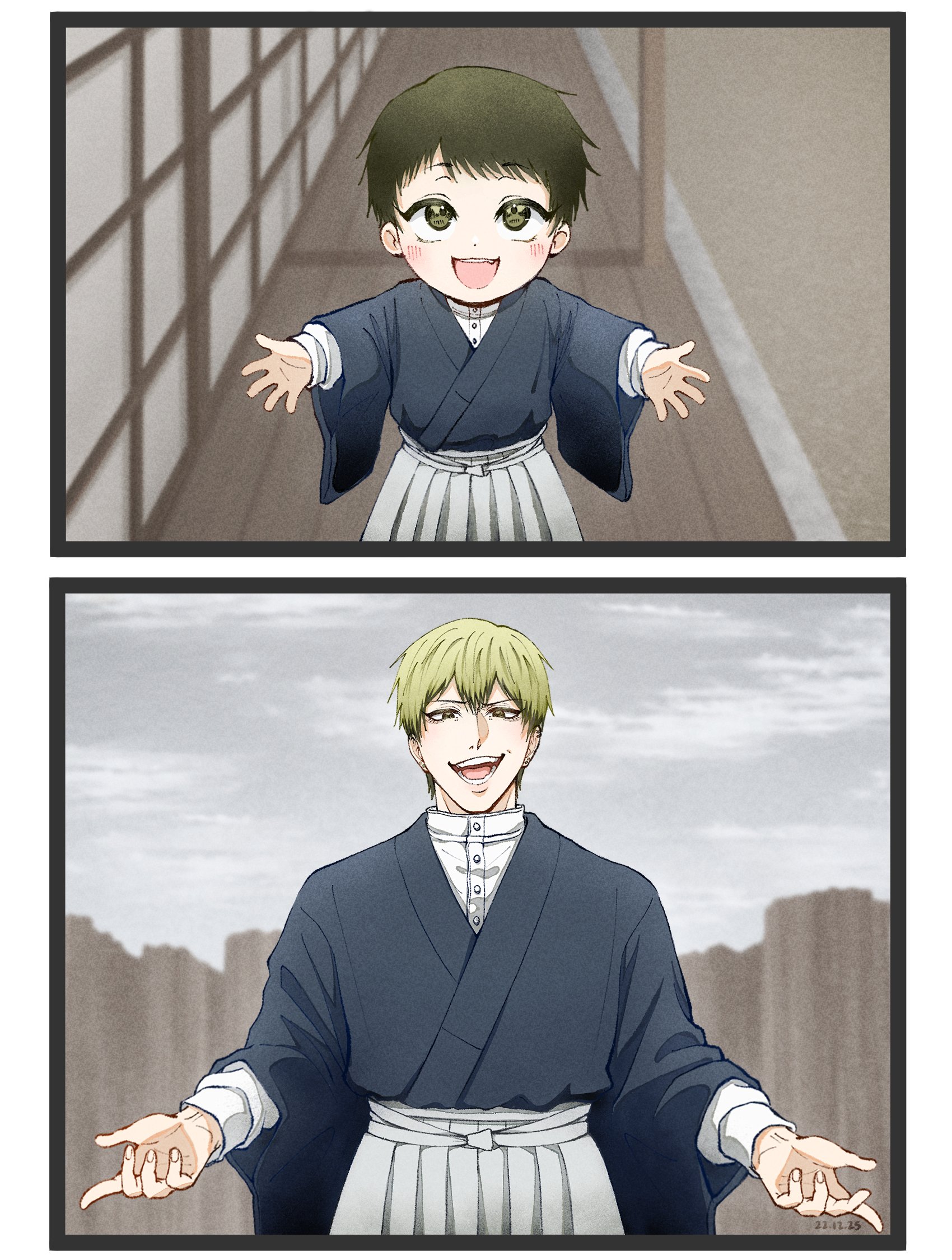 1boy aged_down aged_up black_hair blonde_hair commentary english_commentary highres japanese_clothes jujutsu_kaisen open_mouth shingzu19 short_hair simple_background zen'in_naoya