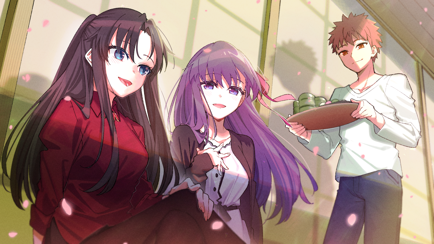1boy 2girls black_hair black_pantyhose blue_eyes blush breasts commentary_request cup dango emiya_shirou fate/stay_night fate_(series) food green_tea hair_down hair_ribbon heaven's_feel large_breasts long_hair long_sleeves matou_sakura multiple_girls open_mouth orange_hair pantyhose plate purple_eyes purple_hair red_ribbon red_shirt ribbon shirt short_hair siblings sisters smile tea teacup tohsaka_rin tohsaka_rin_(unlimited_blade_works) tray uninu wagashi yunomi