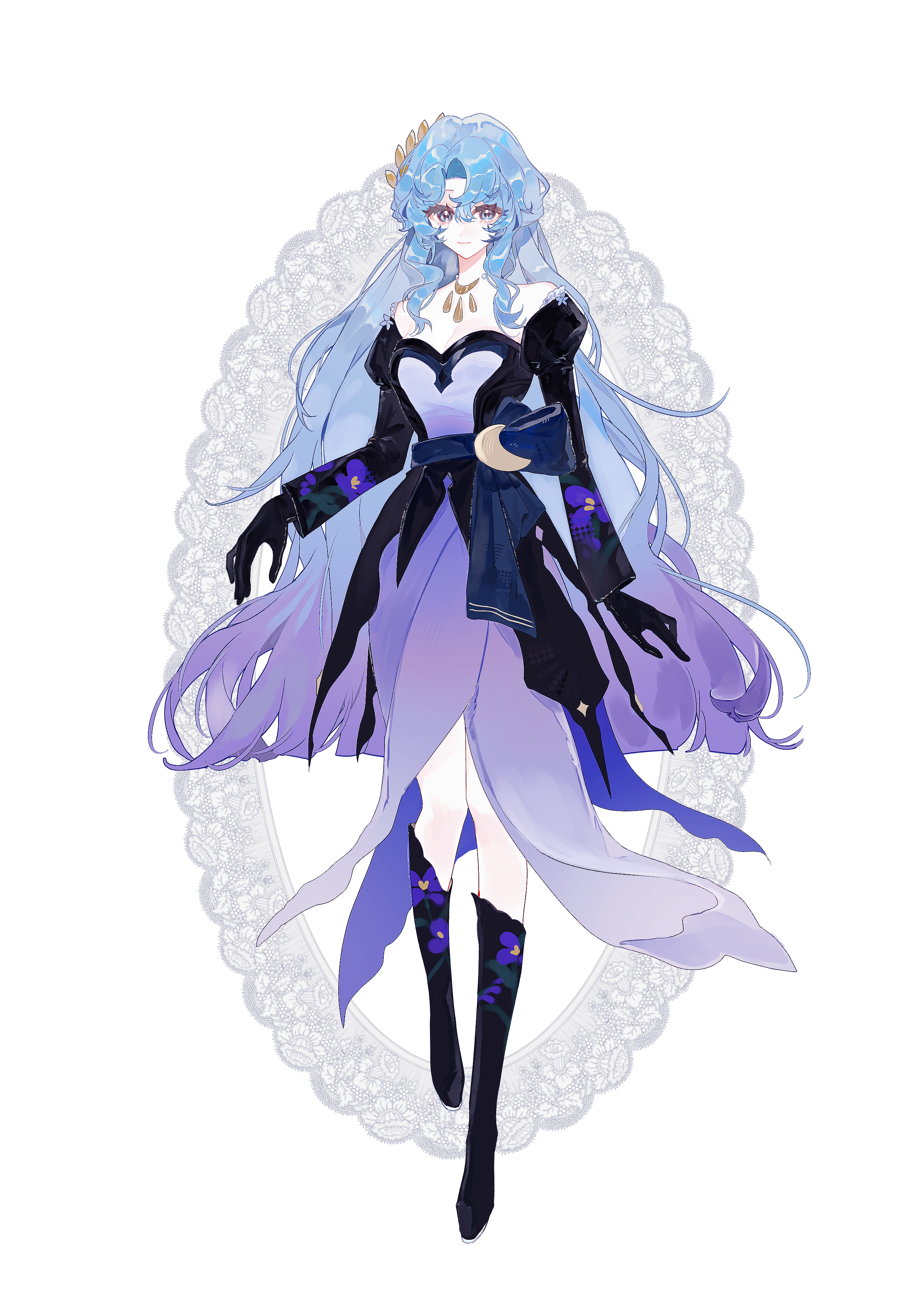 1girl absurdres bare_shoulders belt belt_bow black_boots black_dress black_gloves blue_belt blue_bow blue_eyes blue_hair blunt_ends boots bow breasts chinese_commentary cleavage closed_mouth commentary_request curtained_hair double-parted_bangs dress feather_hair_ornament feathers floral_print floral_print_boots floral_print_dress floral_print_sleeves full_body gloves gold_choker gradient_hair hair_between_eyes hair_ornament highres inverted_eyelashes juliet_sleeves knee_boots knees_together_feet_apart lace_background long_sleeves looking_at_viewer medium_breasts medium_dress moonflower_(plants_vs._zombies) multicolored_hair off-shoulder_dress off_shoulder pale_skin personification plants_vs._zombies plants_vs._zombies_2 print_dress puffy_sleeves purple_dress purple_hair rrtion sidelocks simple_background smile solo standing standing_on_one_leg two-tone_dress two-tone_hair wavy_hair white_background