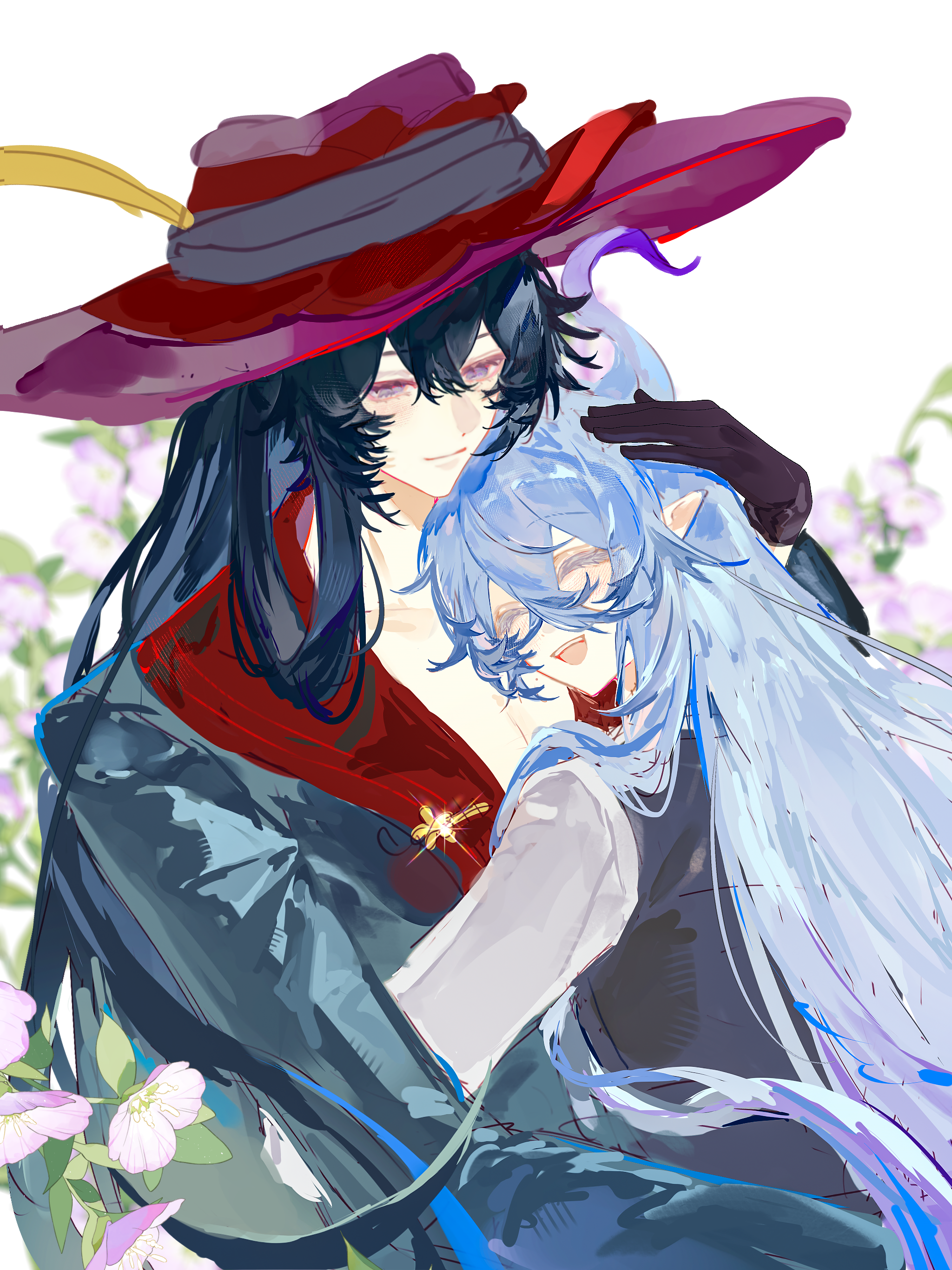 2boys :d ^_^ absurdres bishounen black_gloves black_hair black_vest blue_hair blurry blurry_background broad_shoulders chinese_commentary closed_eyes closed_mouth collarbone colored_eyelashes colored_tips commentary_request crossed_bangs double-parted_bangs flower from_above gloves grey_jacket grimrose_(plants_vs._zombies) hair_between_eyes hand_on_another's_head hand_up hat hat_feather head_rest highres hug jacket large_hat leaf long_hair long_hair_between_eyes long_sleeves looking_at_another looking_down male_focus multicolored_hair multiple_boys open_clothes open_mouth pale_skin pectorals personification pink_flower plants_vs._zombies plants_vs._zombies_2 pointy_ears purple_eyes purple_flower purple_hair red_hat red_sailor_collar ring_sidelocks rrtion sailor_collar shadow_peashooter_(plants_vs._zombies) shirt smile sparkle teeth tongue trap two-tone_hair upper_body upper_teeth_only very_long_hair vest white_background white_shirt