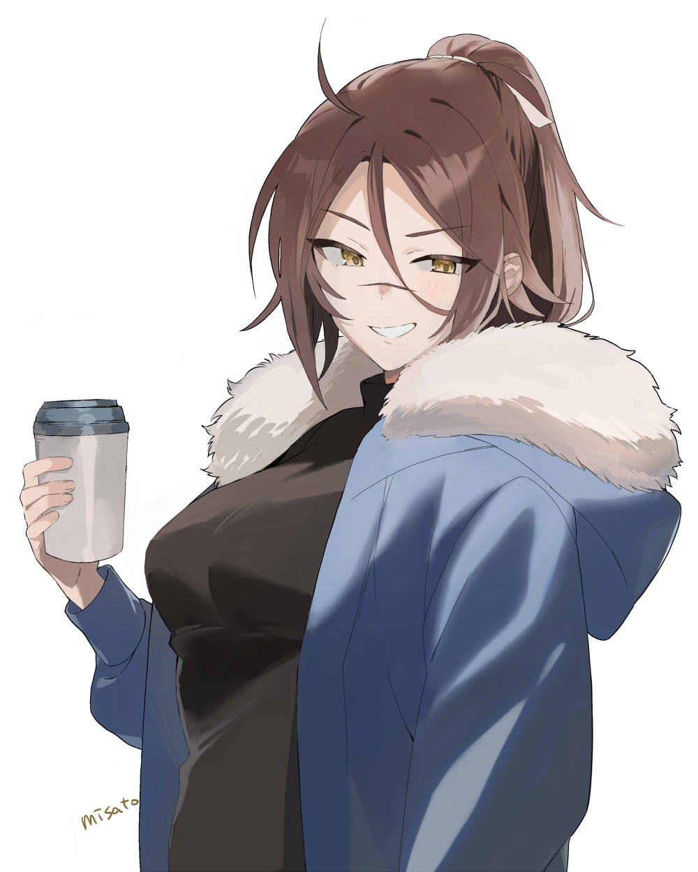 1girl black_shirt blue_jacket blush breasts brown_eyes brown_hair commentary_request cup disposable_coffee_cup disposable_cup fate/grand_order fate_(series) fur_trim grin hair_between_eyes high_ponytail highres jacket long_hair long_sleeves looking_at_viewer medium_breasts misato_pic parted_bangs ponytail scar scar_on_face scar_on_nose shirt smile solo sugitani_zenjubou_(fate)