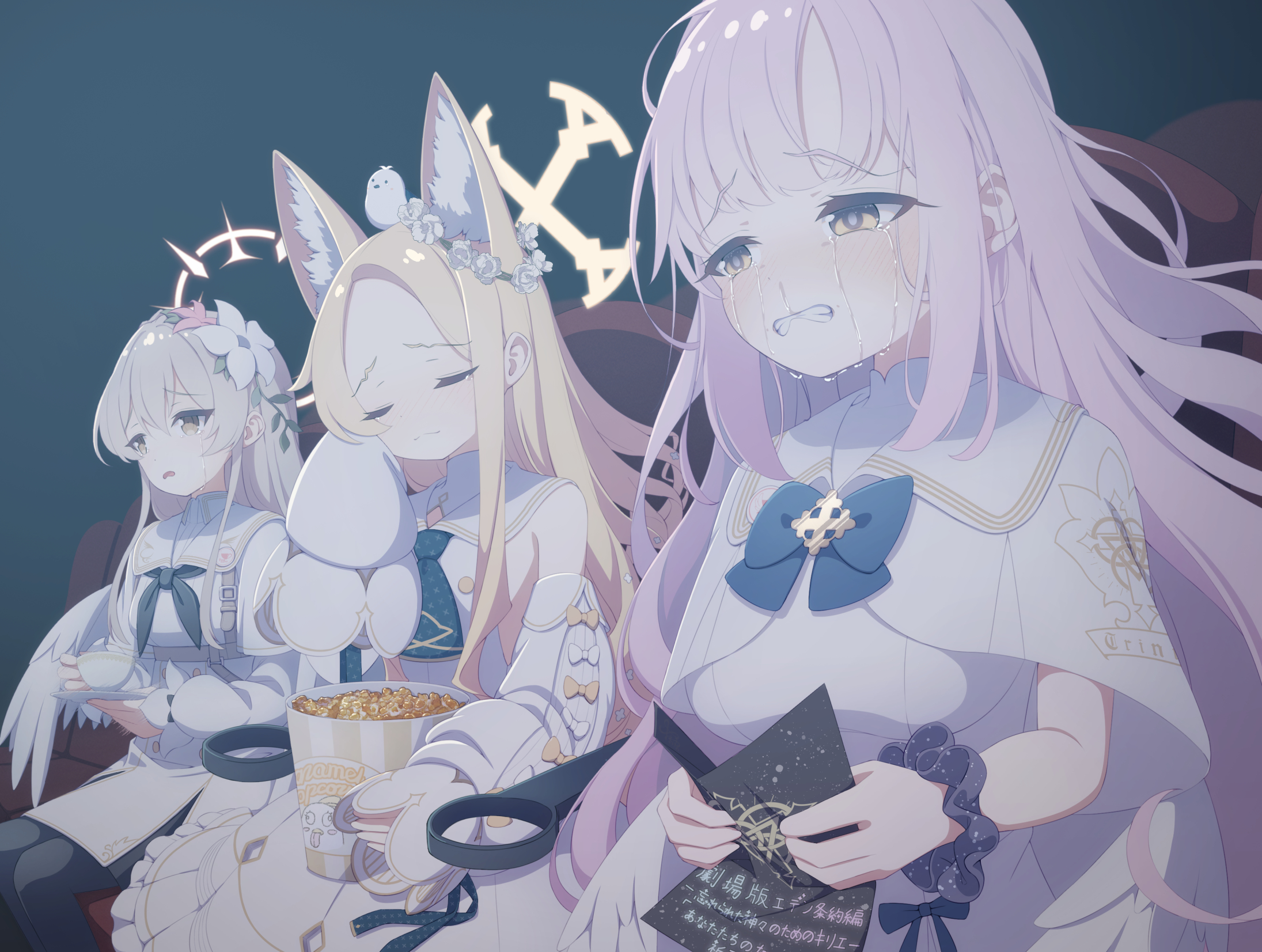 3girls angel_wings animal_ear_fluff animal_ears aqua_hair black_neckerchief blonde_hair blue_archive blue_bow blush bow breasts brown_eyes brown_hair buttons clenched_teeth closed_eyes closed_mouth commentary_request crying cup detached_sleeves dress feathered_wings flower food fox_ears fox_girl gold_trim hair_between_eyes hair_bow hair_flower hair_ornament halo highres holding holding_cup holding_plate long_hair long_sleeves looking_at_another looking_at_viewer low_wings matchamassa medium_breasts mika_(blue_archive) multicolored_hair multiple_girls nagisa_(blue_archive) neckerchief open_mouth pink_hair pink_halo plate popcorn red_halo scrunchie seia_(blue_archive) sleeveless sleeveless_dress smile streaming_tears tea_party_(blue_archive) tears teeth very_long_hair white_bow white_dress white_flower white_wings wide_sleeves wings wrist_scrunchie yellow_eyes yellow_halo