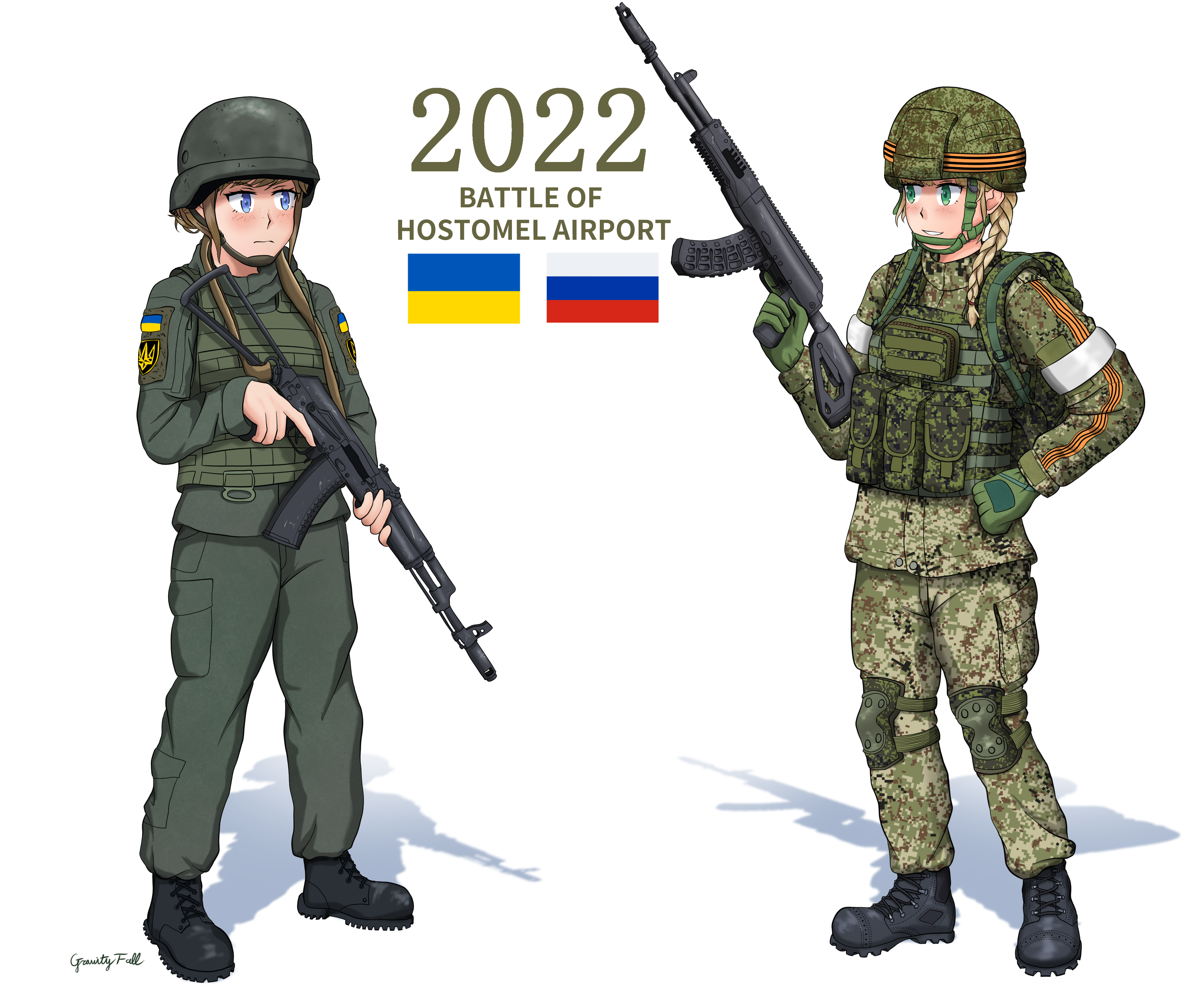 1girl 2girls absurdres ak-12 ak-74 armband assault_rifle black_boots blonde_hair blue_eyes body_armor boots braid brown_hair camouflage camouflage_jacket camouflage_pants combat_helmet commentary english_commentary flag_patch gloves gravityfalls618 green_eyes green_gloves grin gun hand_on_own_hip helmet highres holding holding_weapon jacket kalashnikov_rifle knee_pads military military_combat_uniform military_uniform multiple_girls original pants ribbon_of_saint_george rifle russian_flag russo-ukrainian_war smile soldier solo tactical_clothes tactical_gloves tryzub ukraine ukrainian_flag ukrainian_ground_forces vdv weapon white_armband