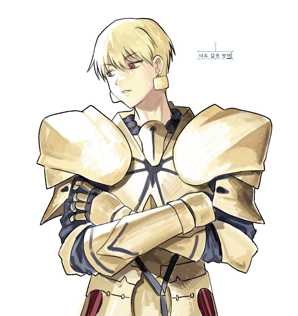 1boy armor blonde_hair clenched_teeth crossed_arms ddong_pong earrings fate_(series) gilgamesh_(fate) gold_armor gold_earrings jewelry korean_text male_focus parted_lips red_eyes short_hair simple_background solo teeth translation_request upper_body white_background