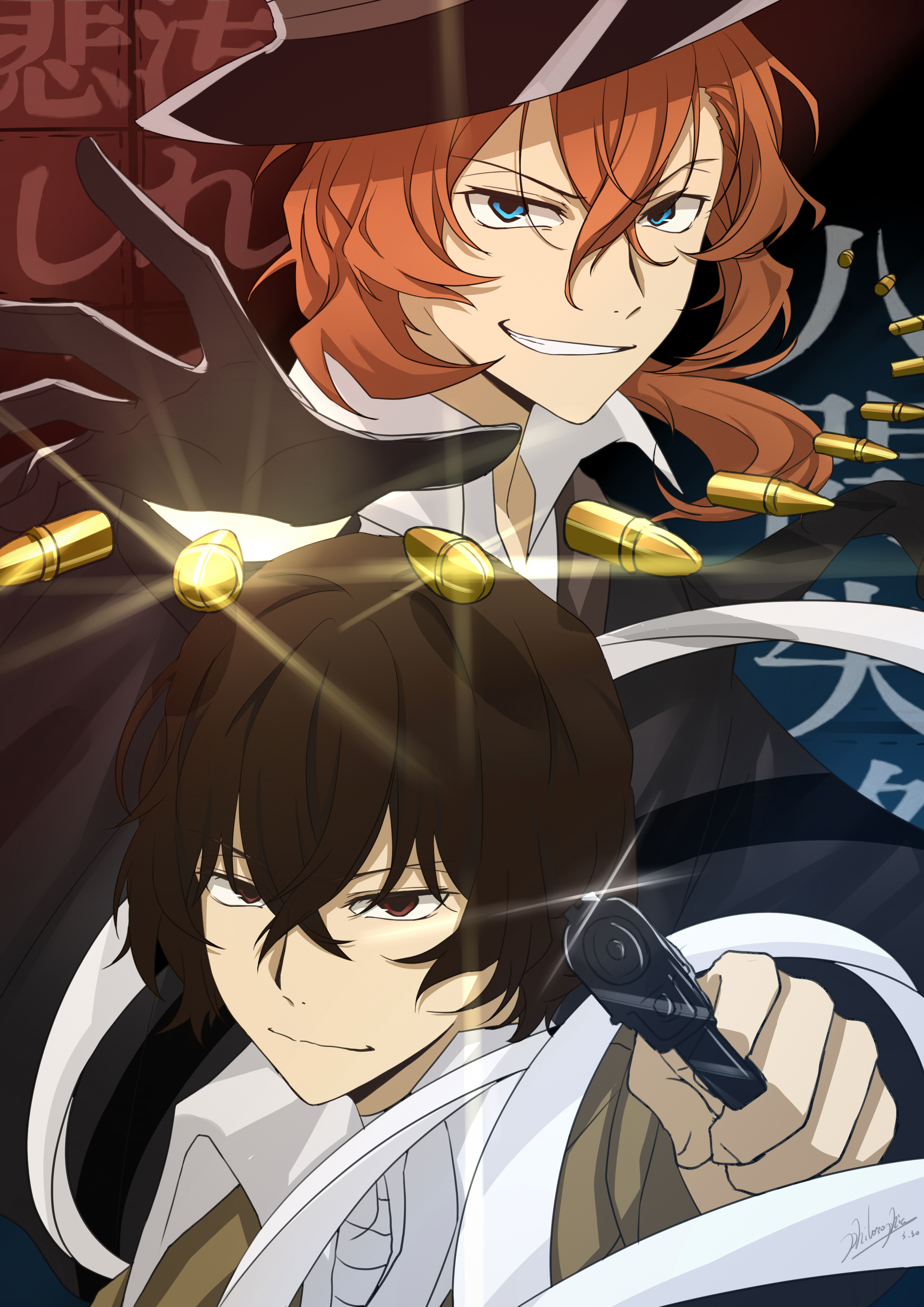 2boys absurdres aiming aiming_at_viewer bandaged_neck bandages black_gloves blue_eyes brown_eyes brown_hair bullet bungou_stray_dogs closed_mouth commentary_request crossed_bangs dazai_osamu_(bungou_stray_dogs) gloves gun hair_between_eyes hand_up handgun highres holding holding_gun holding_weapon looking_at_viewer male_focus multiple_boys nakahara_chuuya_(bungou_stray_dogs) official_style orange_hair philosophia short_hair smile weapon