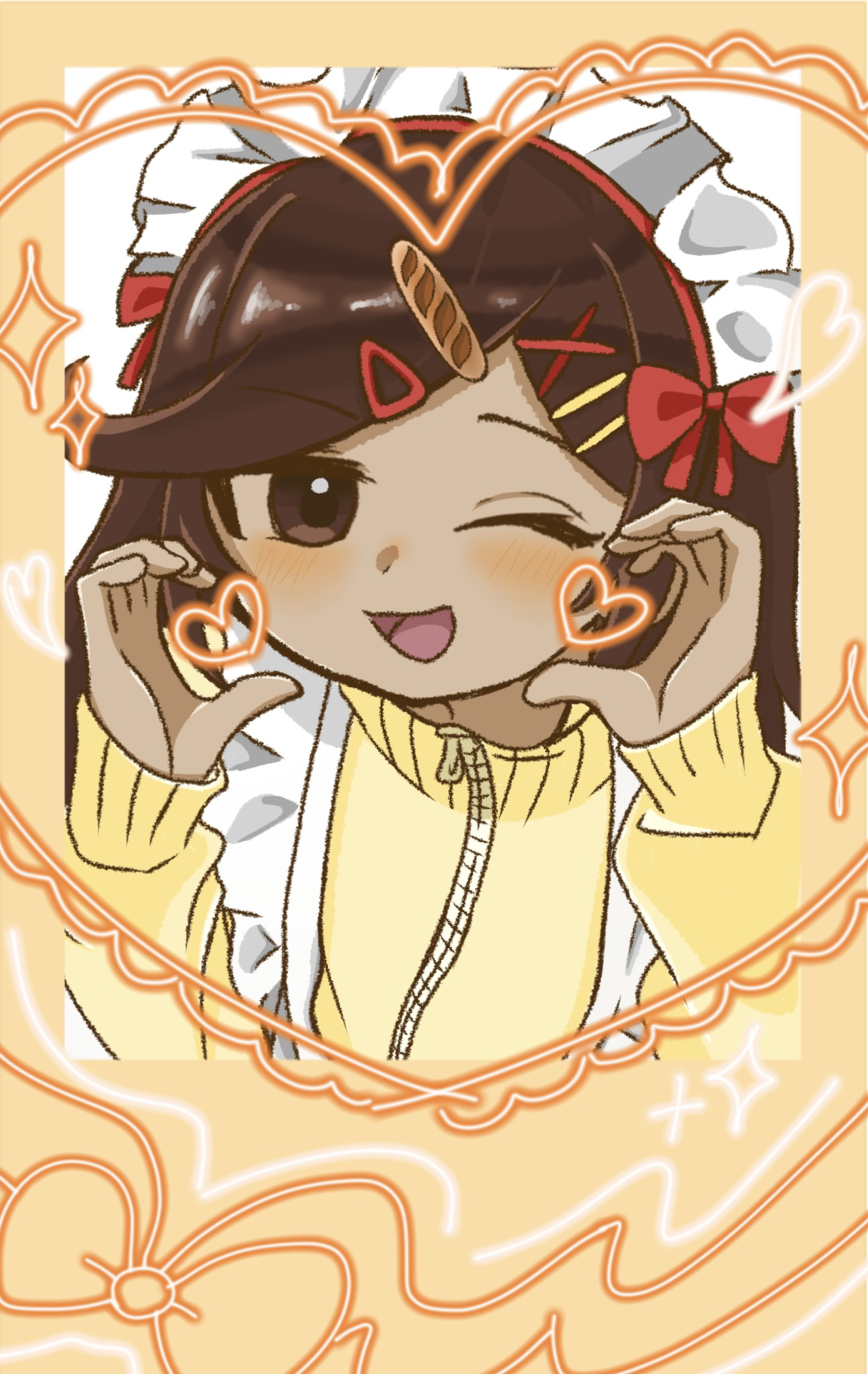 1girl alternate_costume amaka_la22 blush brown_eyes brown_hair commentary_request daphne_(omori) dark-skinned_female dark_skin enmaided hair_ornament hairclip highres jersey_maid long_hair long_sleeves looking_at_viewer maid maid_headdress omori one_eye_closed open_mouth parted_bangs smile solo unconventional_maid upper_body zipper zipper_pull_tab