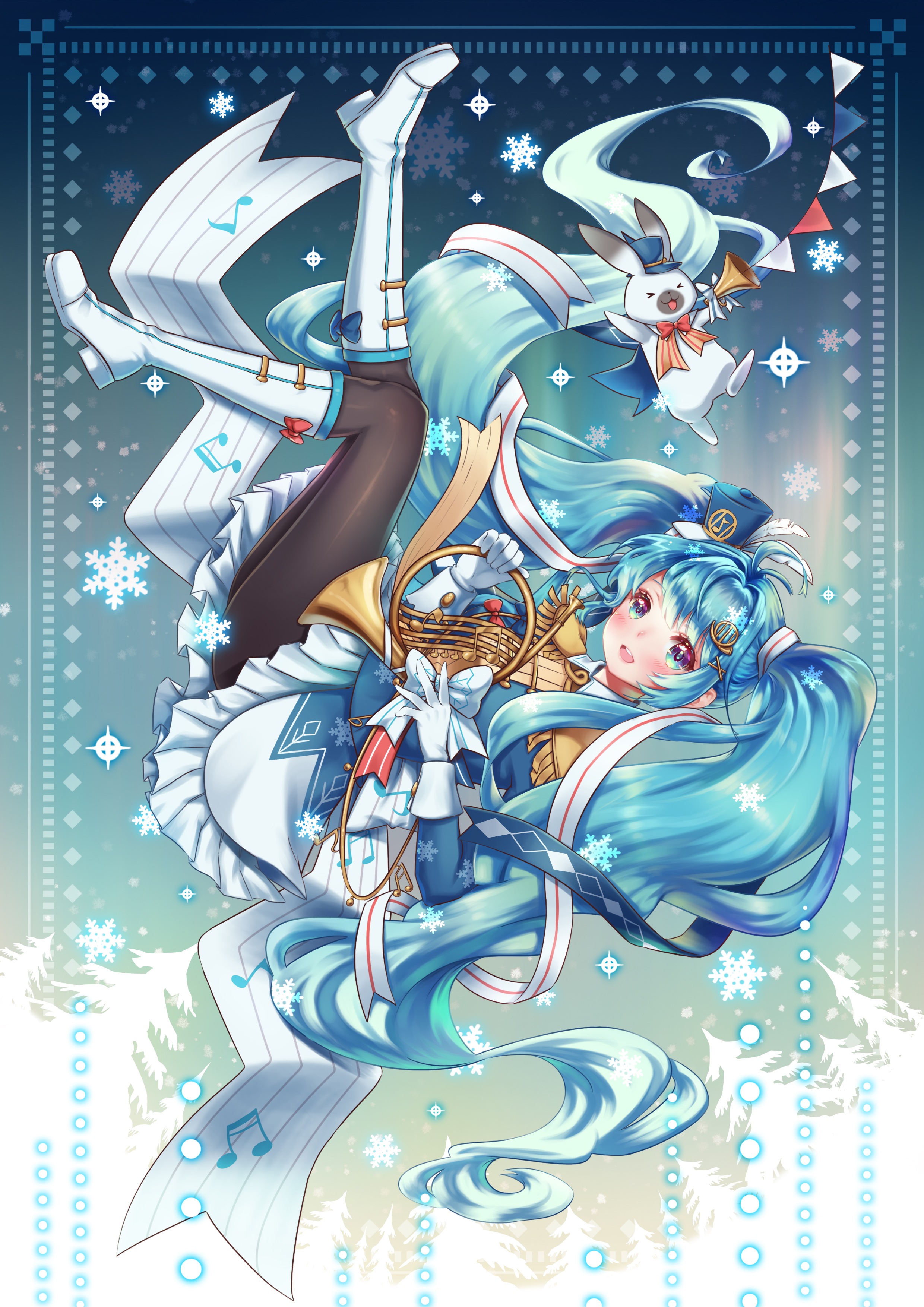 1girl absurdres animal aqua_eyes aqua_hair band_uniform black_pantyhose blush boots commentary_request epaulettes french_horn fringe_trim full_body gloves hair_between_eyes hair_ornament hat hat_feather hatsune_miku highres holding instrument long_hair looking_at_viewer mini_hat mini_shako_cap musical_note musical_note_print official_alternate_costume official_alternate_hairstyle open_mouth pantyhose pleated_skirt rabbit rabbit_yukine shako_cap skirt smile snowflake_print ssosso twintails very_long_hair vocaloid white_boots white_gloves white_rabbit_(animal) white_skirt yuki_miku yuki_miku_(2020)