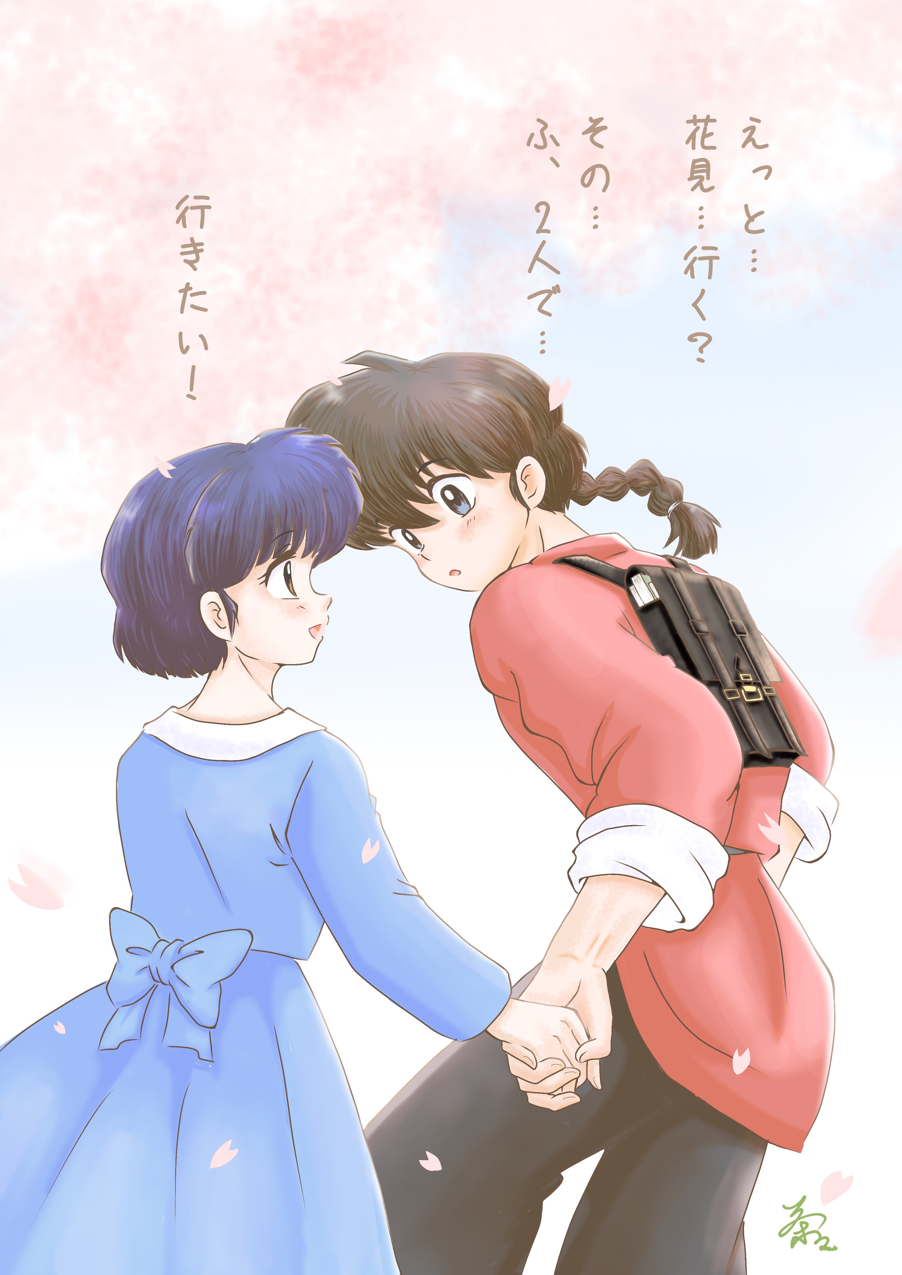 1boy 1girl :o absurdres backpack bag black_hair black_pants blue_dress blue_eyes blue_hair braid brown_bag brown_eyes chacha_r_a commentary_request couple dress fuurinkan_high_school_uniform hetero highres holding_hands open_mouth pants ranma_1/2 saotome_ranma school_uniform short_hair single_braid smile tendou_akane translation_request