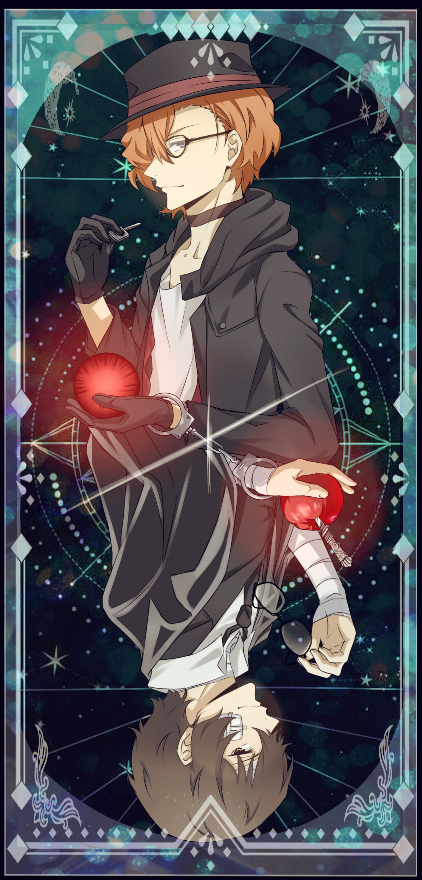 2boys absurdres apple bandaged_arm bandages black_choker black_gloves black_hat black_jacket blue_eyes brown_eyes brown_hair bungou_stray_dogs choker closed_mouth commentary cuffs dazai_osamu_(bungou_stray_dogs) food fruit glasses gloves hand_up handcuffs hat highres holding holding_food holding_fruit holding_key holding_orb holding_removed_eyewear jacket key long_sleeves looking_at_viewer male_focus multiple_boys nakahara_chuuya_(bungou_stray_dogs) orange_hair orb philosophia rotational_symmetry shared_handcuffs short_hair smile unworn_eyewear