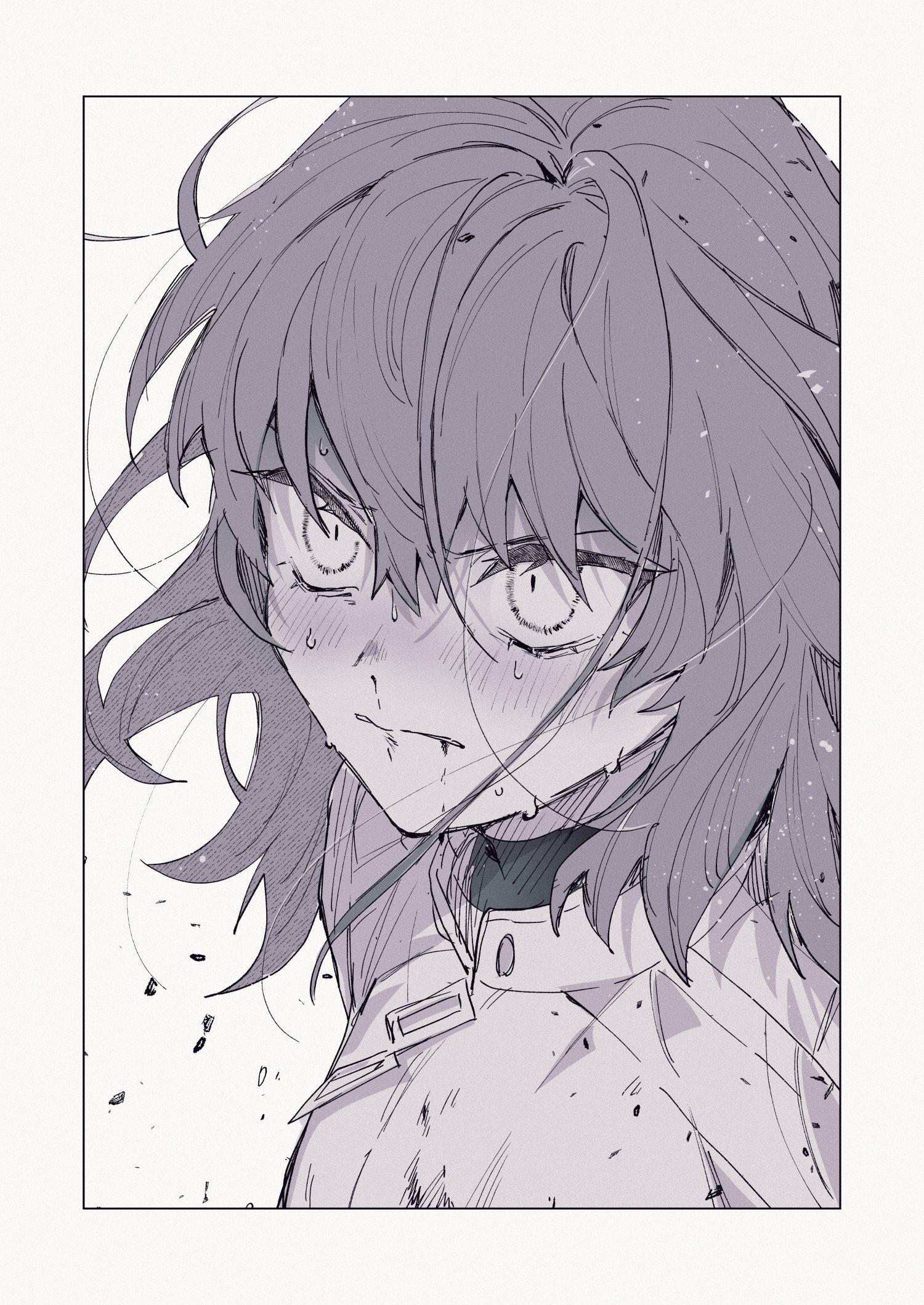 1girl border chaldea_logo commentary english_commentary fate/grand_order fate_(series) fujimaru_ritsuka_(female) fujimaru_ritsuka_(female)_(decisive_battle_chaldea_uniform) greyscale highres injury looking_ahead medium_hair monochrome nahui_mictlan_(fate/grand_order) portrait solo sweat wani_(mezo)