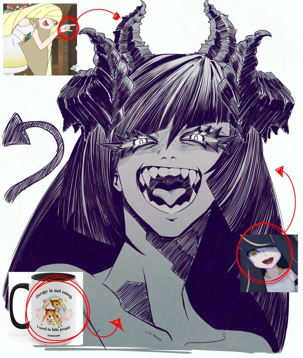 1girl andrich_galam blunt_bangs collarbone commentary crazy_smile dark_persona demon_girl demon_horns demon_tail english_commentary greyscale highres horns long_hair looking_at_viewer lusamine_(pokemon) monochrome nintendo open_mouth pokemon pokemon_(anime) pokemon_sun_and_moon pokemon_the_series:_sun_&_moon portrait sharp_teeth smile solo tail teeth