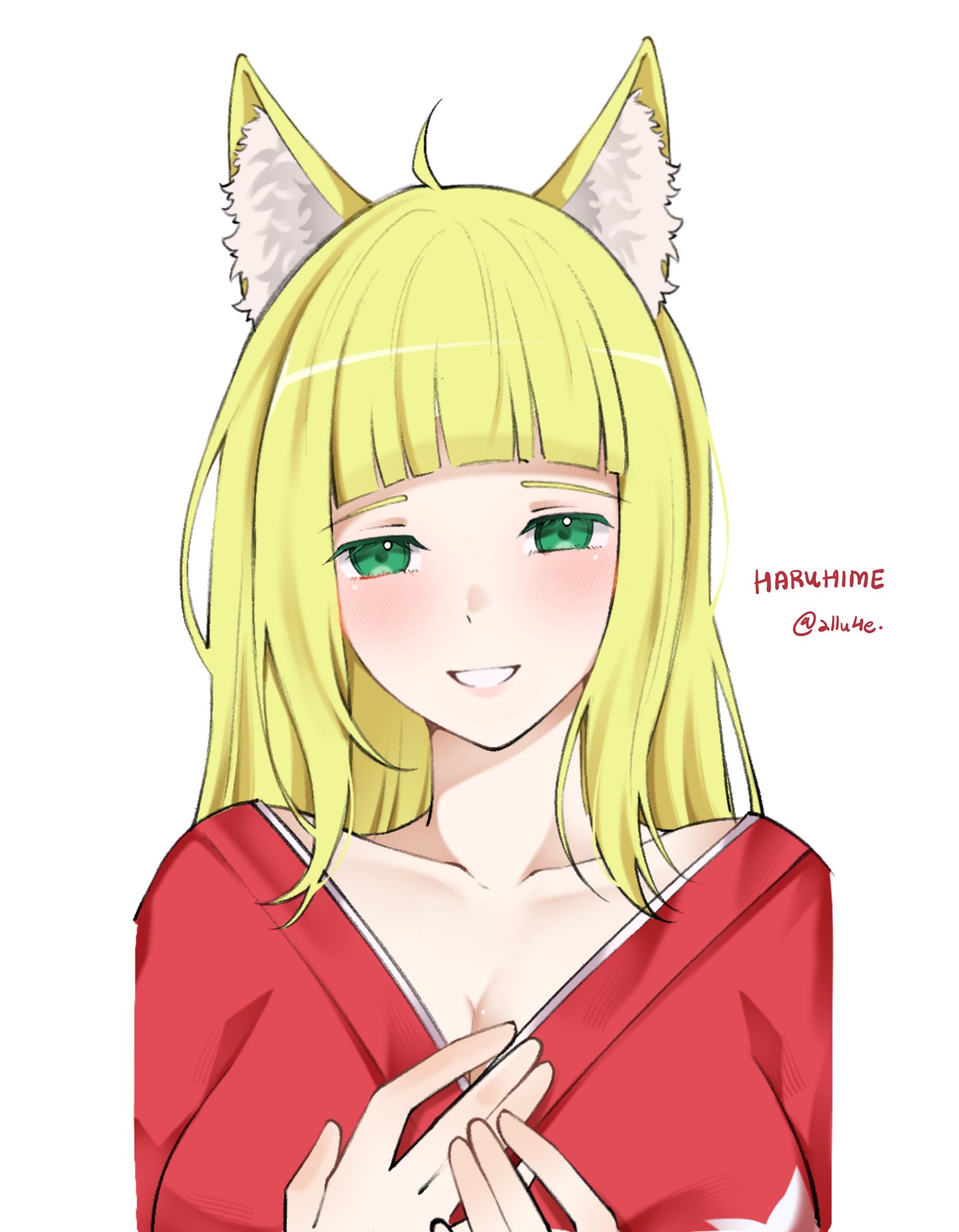 1girl allu4e animal_ear_fluff artist_name blonde_hair breasts character_name collarbone commentary dungeon_ni_deai_wo_motomeru_no_wa_machigatteiru_darou_ka green_eyes highres japanese_clothes kimono large_breasts long_hair looking_at_viewer open_mouth red_kimono sanjouno_haruhime smile solo