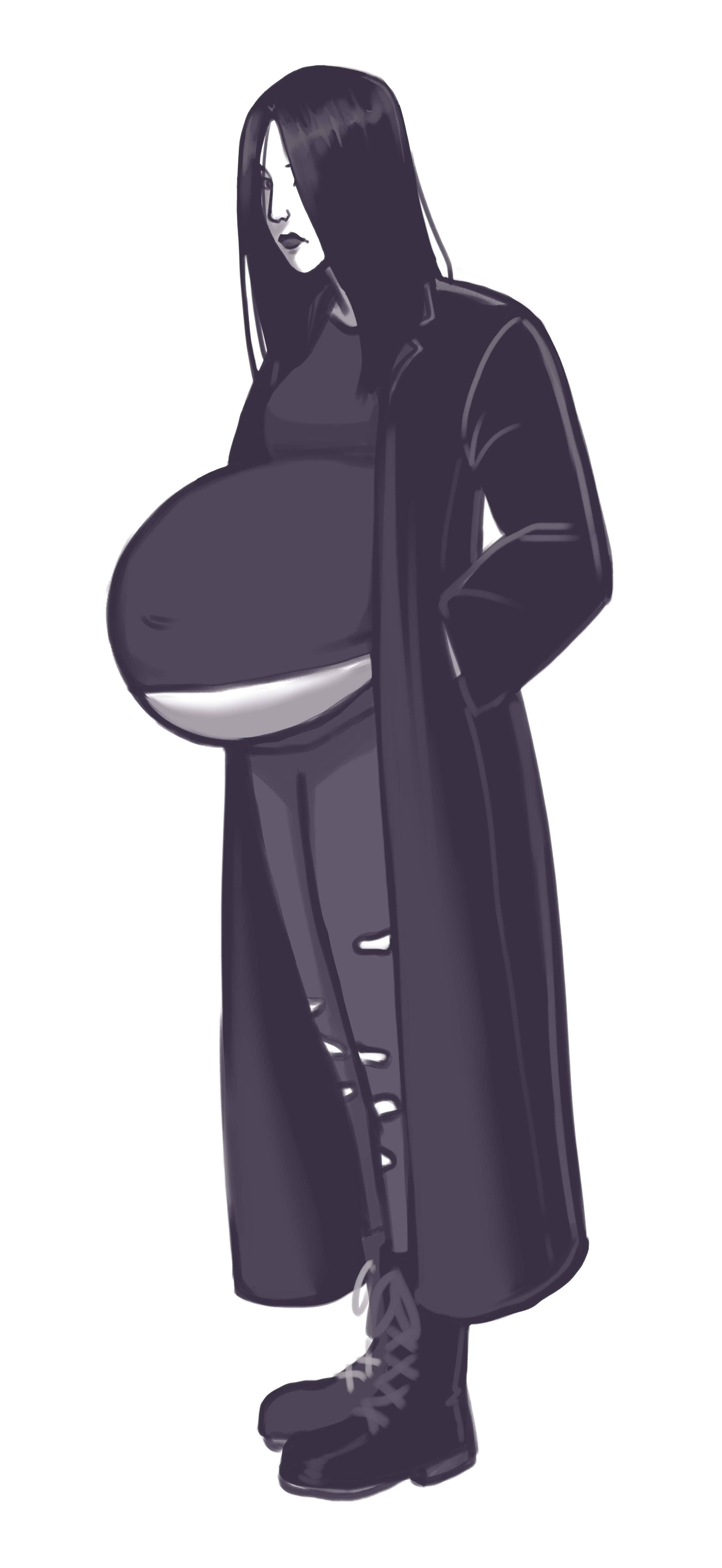 black_boots black_coat black_hair black_shirt boots coat commission commissioner_upload emo_fashion hands_in_pockets long_hair monochrome olympic-dames one_eye_covered pregnant sad second-party_source shirt solo the_boys the_female_(the_boys) tomboy torn_clothes trench_coat