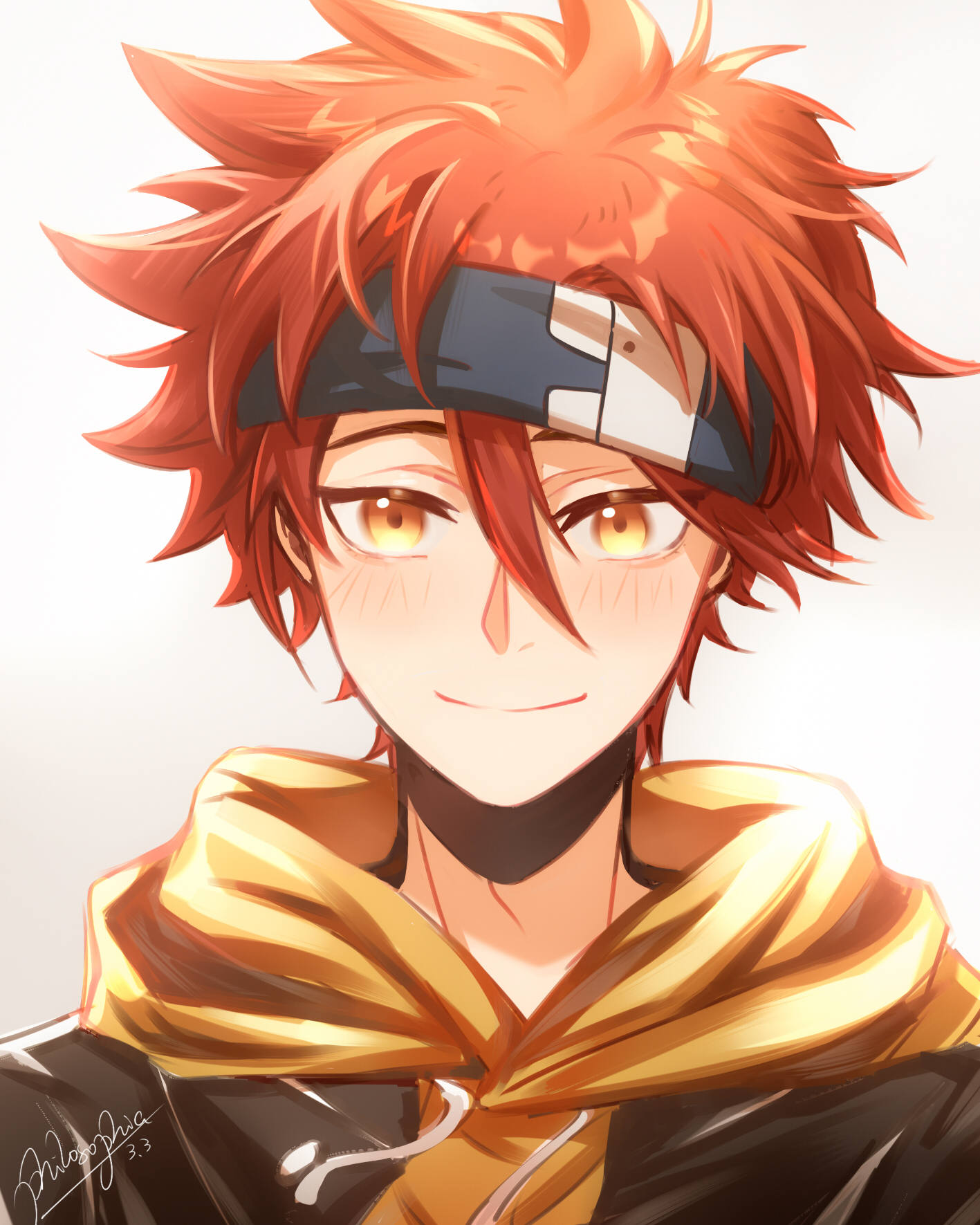1boy black_hairband closed_mouth commentary double-parted_bangs hair_between_eyes hairband happy highres hood hood_down hoodie kyan_reki looking_at_viewer male_focus philosophia portrait red_hair short_hair simple_background sk8_the_infinity smile solo straight-on white_background yellow_eyes yellow_hoodie