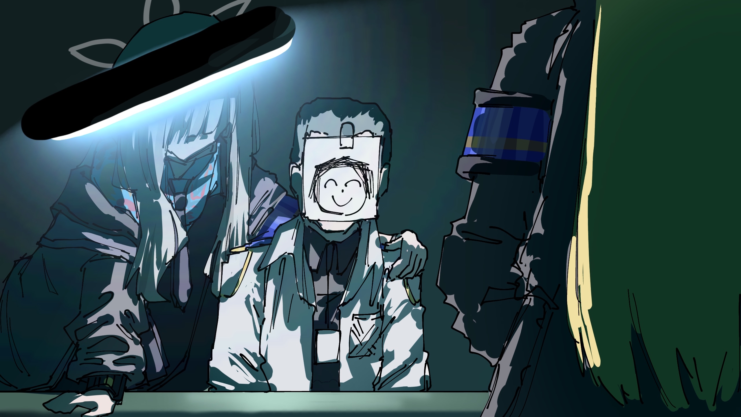 1boy 2girls animal_ears armband black_background black_hat black_jacket black_shirt blonde_hair blue_archive blue_scarf coat collared_shirt commentary_request doodle_sensei_(blue_archive) ghost_in_the_shell gloves grey_hair halo hand_on_another's_shoulder hat highres interrogation jacket kanna_(blue_archive) konoka_(blue_archive) long_hair long_sleeves monitor multiple_girls necktie open_clothes parody scarf scene_reference sensei_(blue_archive) shirt sketch upper_body white_jacket wu-234