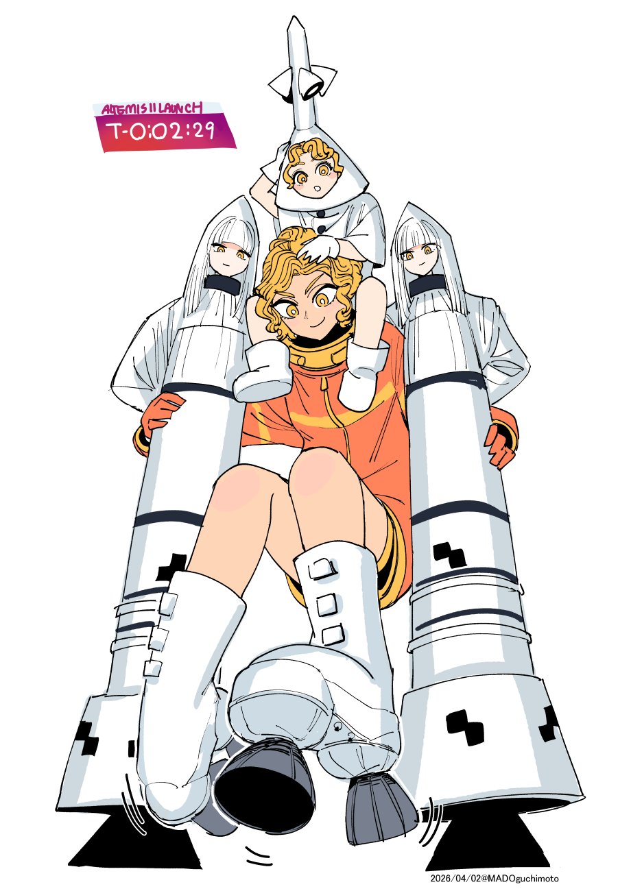 4girls artemis_ii artemis_program astronaut blonde_hair blunt_bangs blunt_ends boots bright_pupils chestnut_mouth countdown_timer dated english_text highres long_hair mado_(mukade_tou) multiple_girls original personification rocket short_hair thrusters twitter_username white_background white_boots white_hair white_pupils yellow_eyes