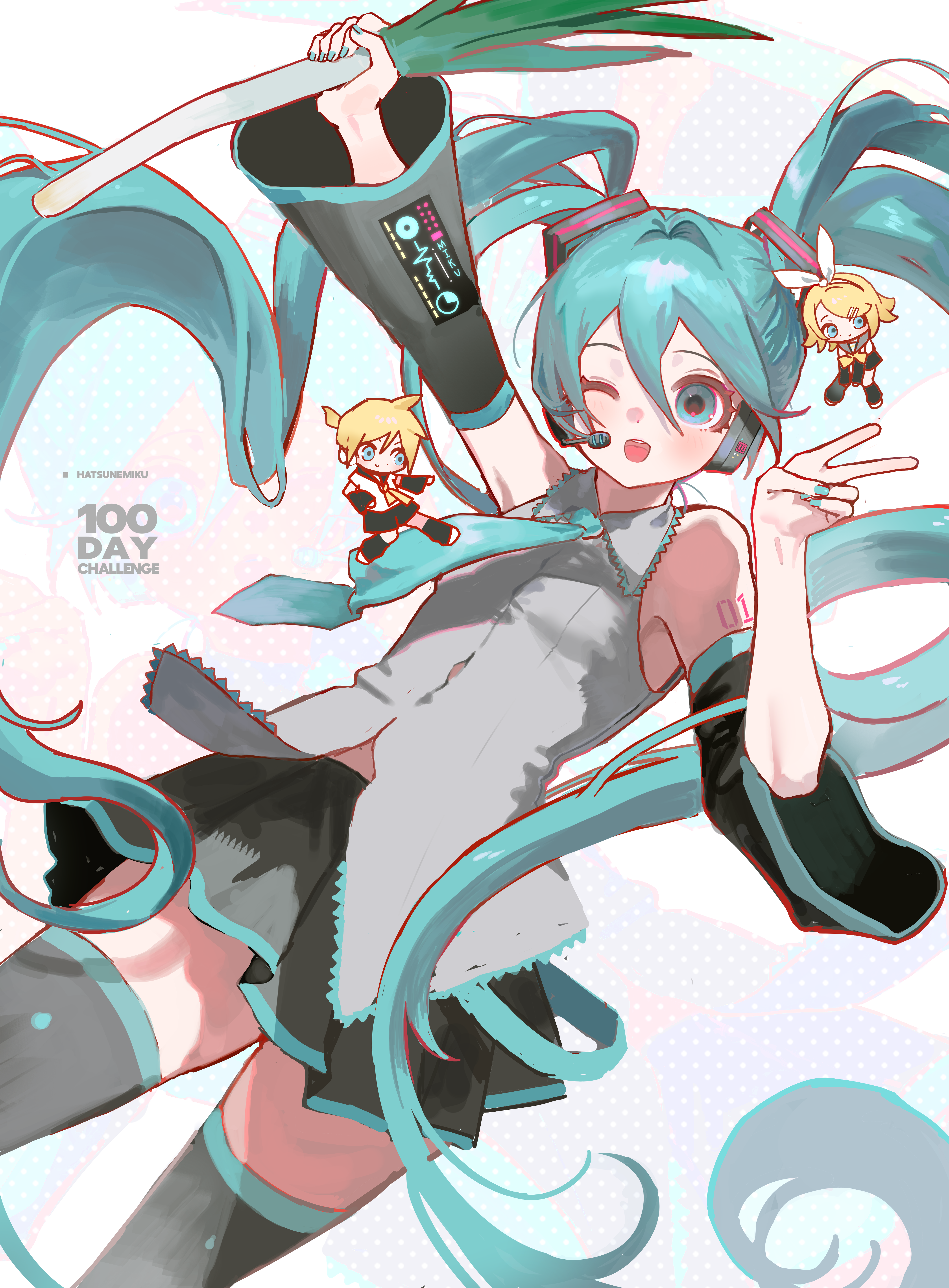 1boy 2girls absurdres aqua_eyes aqua_hair aqua_nails aqua_necktie black_skirt black_sleeves black_thighhighs blonde_hair breasts city_(nnnnnnn_100) detached_sleeves grey_shirt hatsune_miku headset highres kagamine_len kagamine_rin long_hair looking_at_viewer mini_person miniboy minigirl multiple_girls necktie number_tattoo one_eye_closed open_mouth shirt skirt sleeveless sleeveless_shirt small_breasts solo_focus spring_onion tattoo thighhighs twintails v vocaloid