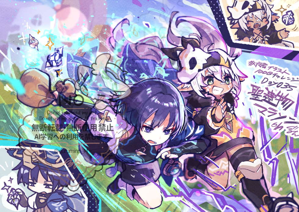 1boy 1girl ahoge animal_ears arm_at_side armor black_bodysuit black_bridal_gauntlets black_headband black_sandals black_shoes black_shorts black_sleeves black_socks black_thighhighs blue_cape blue_hat blue_jingasa blue_sky blunt_ends blush bodysuit bridal_gauntlets bright_pupils cape choppy_bangs closed_eyes cloud cloudy_sky commentary_request cow_ears dark-skinned_female dark_skin dress earrings eyeliner facing_to_the_side floating floating_object flying fur-trimmed_dress fur_trim furisode genshin_impact glowing_markings gold gold_ring grass green_eyes grin gurumin_(gurruguru) hair_between_eyes hakama hakama_shorts halo halo_behind_head hand_up hat headband holding iansan_(genshin_impact) japanese_armor japanese_clothes jewelry jingasa kimono knee_pads kote kurokote leg_warmers long_hair long_sleeves looking_at_object looking_to_the_side makeup mask mask_on_head mid-stride middle_ring motion_lines open_hand open_mouth outdoors pleated_shorts purple_electricity purple_eyes purple_hair red_eyeliner running sack sandals scaramouche_(genshin_impact) shoes short_dress short_eyebrows shorts shoulder_peek side_cape single_sock single_thighhigh skull_mask sky smile socks teeth thighhighs toeless_legwear toes wanderer_(genshin_impact) white_hair white_leg_warmers white_pupils yellow_dress zouri