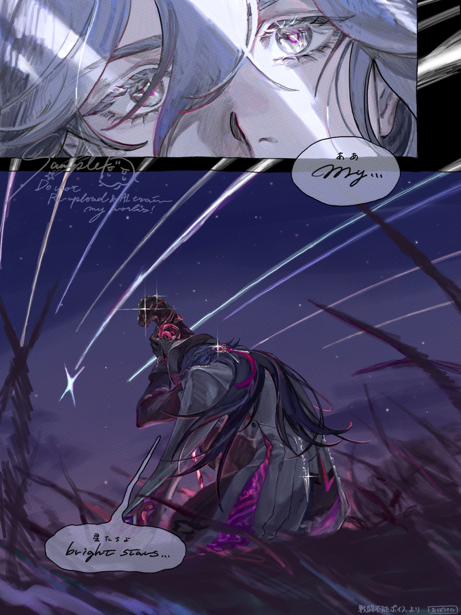 1boy ashveil_(honkai:_star_rail) black_hair bright_pupils chain clenched_hand commentary cutoffs eyelashes fedora ghost_to_human gloves grass grey_eyes hair_between_eyes hair_ornament hat highres honkai:_star_rail honkai_(series) jacket jewelry kneeling male_focus pants purple_sky ring shooting_star single_glove sky speech_bubble