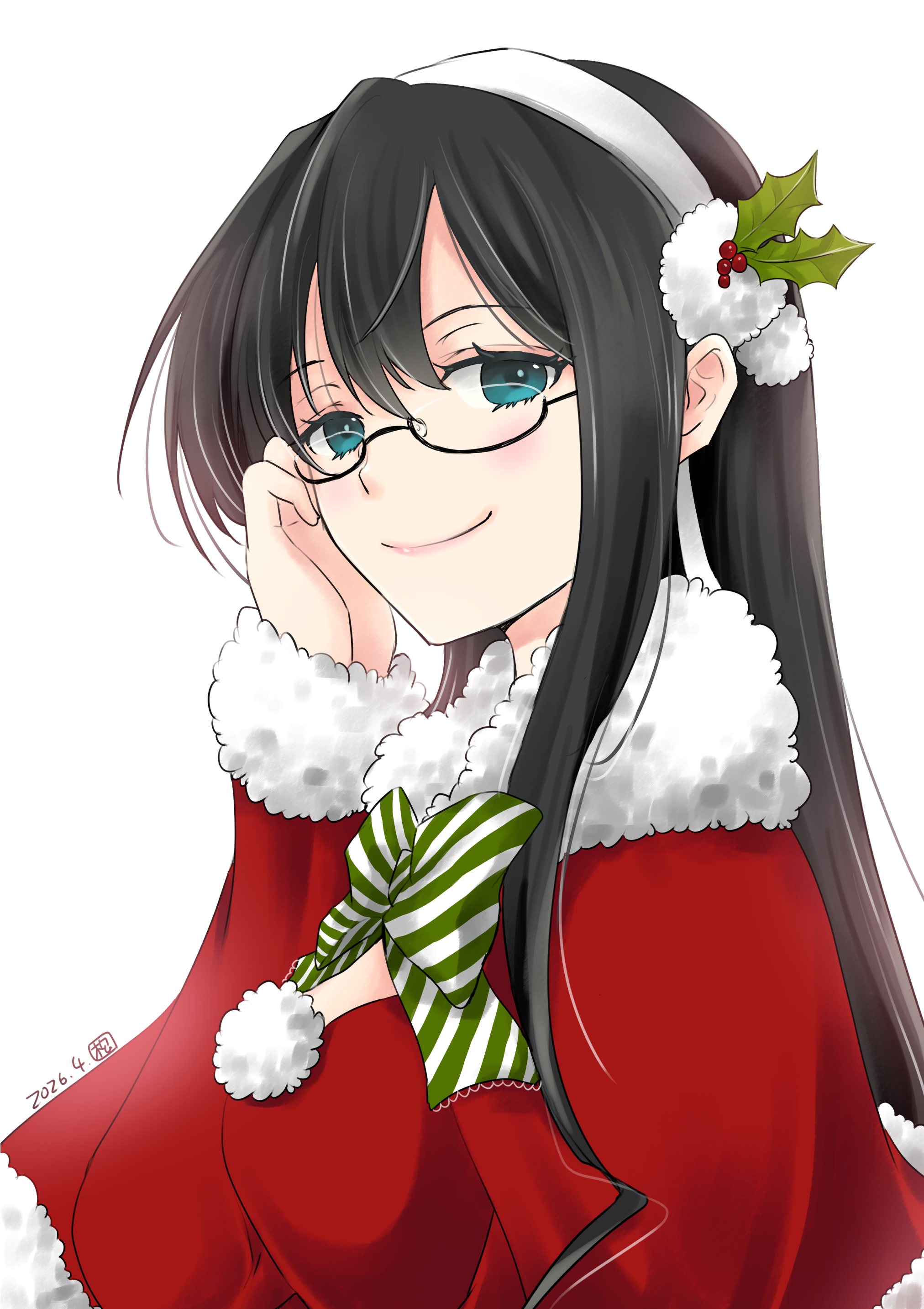1girl absurdres black_hair bow bowtie capelet commentary_request fur-trimmed_capelet fur_trim glasses green_bow green_bowtie green_eyes hair_ornament hairband highres holly_hair_ornament kantai_collection long_hair matsuura@parao one-hour_drawing_challenge ooyodo_(christmas)_(kancolle) ooyodo_(kancolle) red_capelet semi-rimless_eyewear simple_background smile solo striped_bow striped_bowtie striped_clothes white_background white_hairband