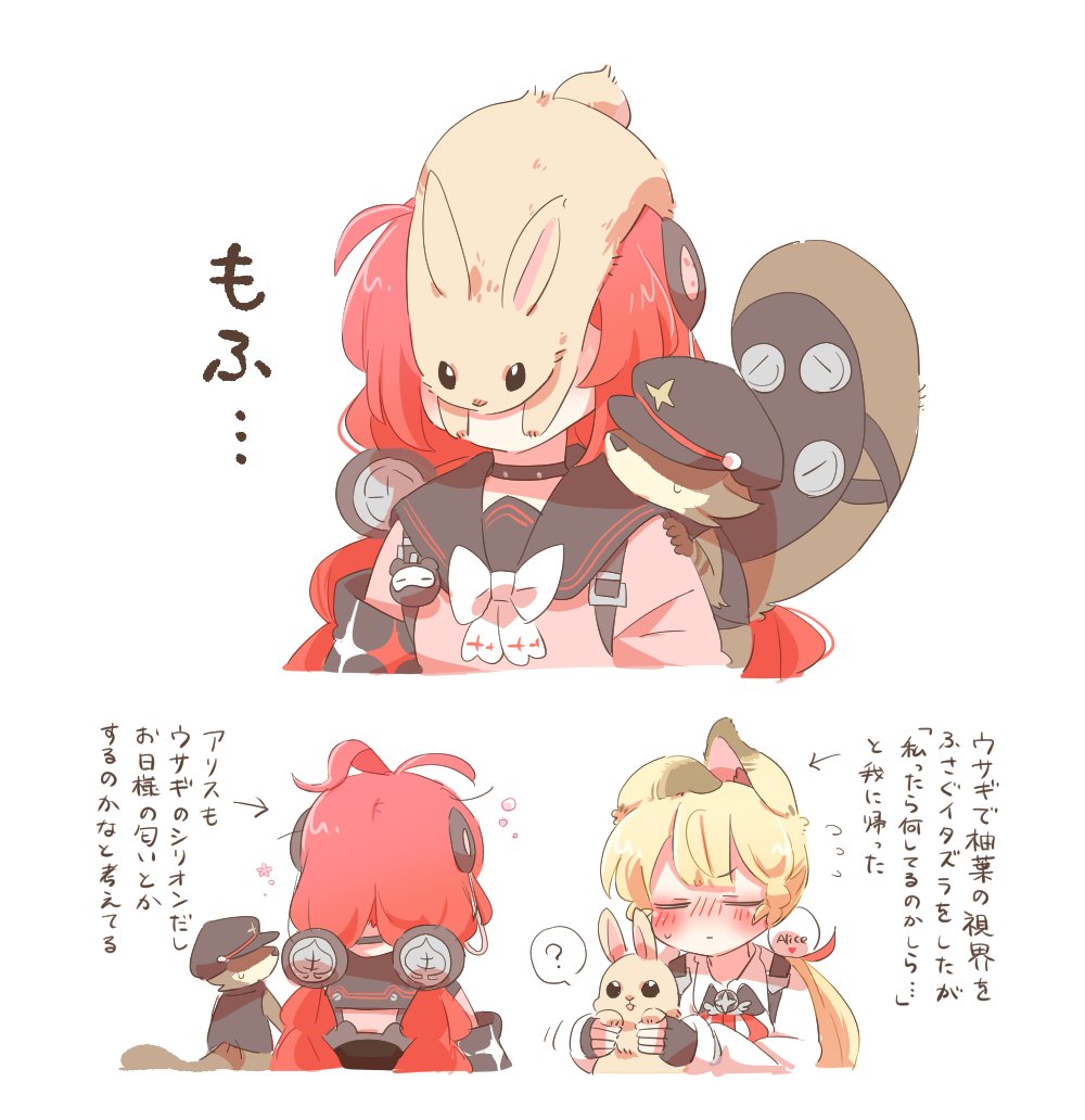 2girls ? alice_thymefield animal animal_ear_fluff animal_ears animal_on_back animal_on_head arrow_(symbol) black_gloves black_sailor_collar blonde_hair blush braid braided_twintails cardigan chest_bow closed_eyes closed_mouth commentary_request fingerless_gloves flying_sweatdrops gloves hair_ornament hearing_aid holding holding_animal holding_rabbit kamanosuke_(zenless_zone_zero) long_hair low_twintails motion_lines multiple_girls on_head pink_cardigan rabbit rabbit_ears rabbit_girl rabbit_on_head raccoon rebecca_(keinelove) red_hair sailor_collar shirt simple_background sphere_hair_ornament spoken_question_mark tanuki translation_request twintails ukinami_yuzuha white_background white_shirt zenless_zone_zero