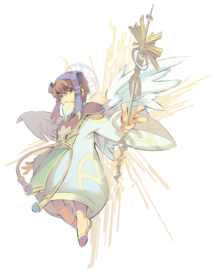 1boy blue_eyes blue_headband blue_robe brown_hair capelet emil_chronicle_online halo hanehane_kiro headband holding holding_wand official_art red_capelet red_socks robe socks solo wand white_background white_wings wings